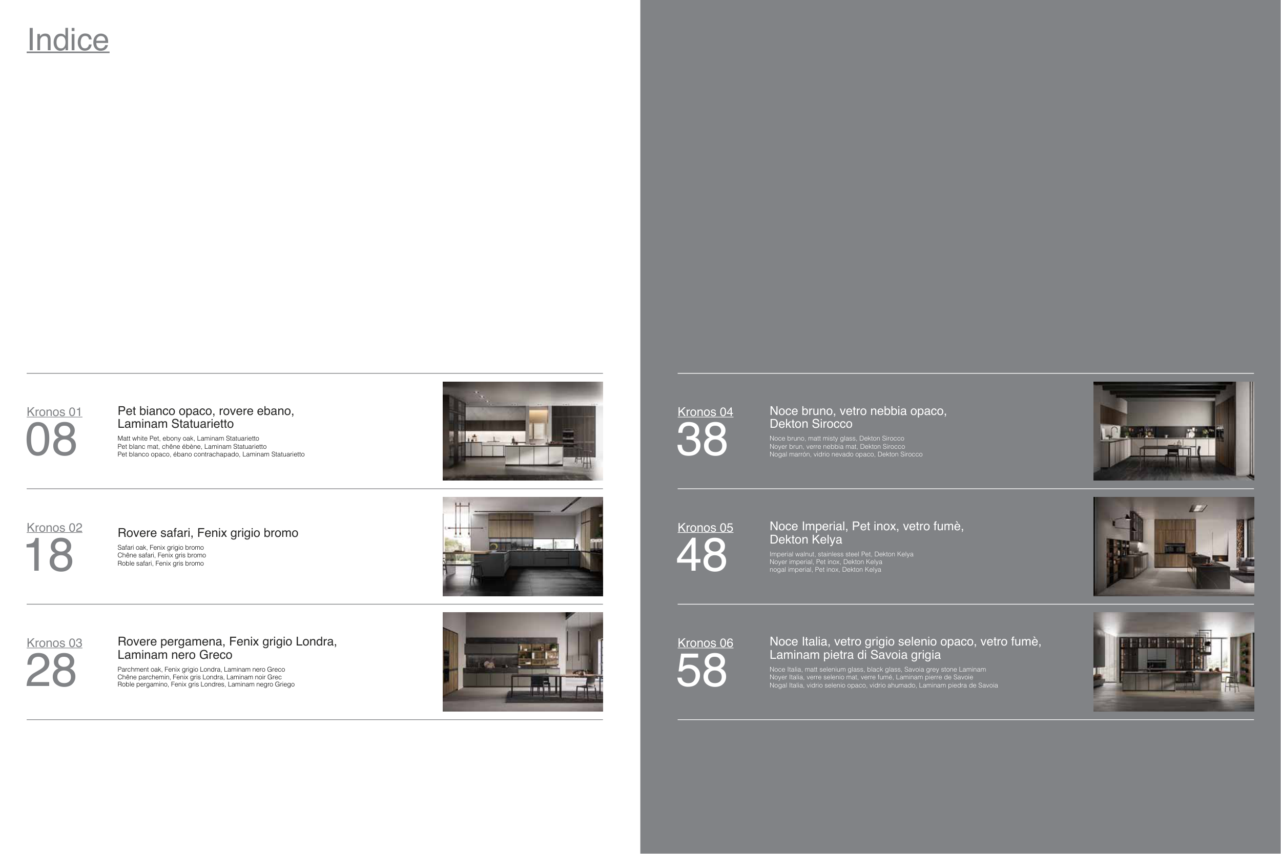 Noce Italia, matt selenium glass, black glass, Savoia grey stone Laminam