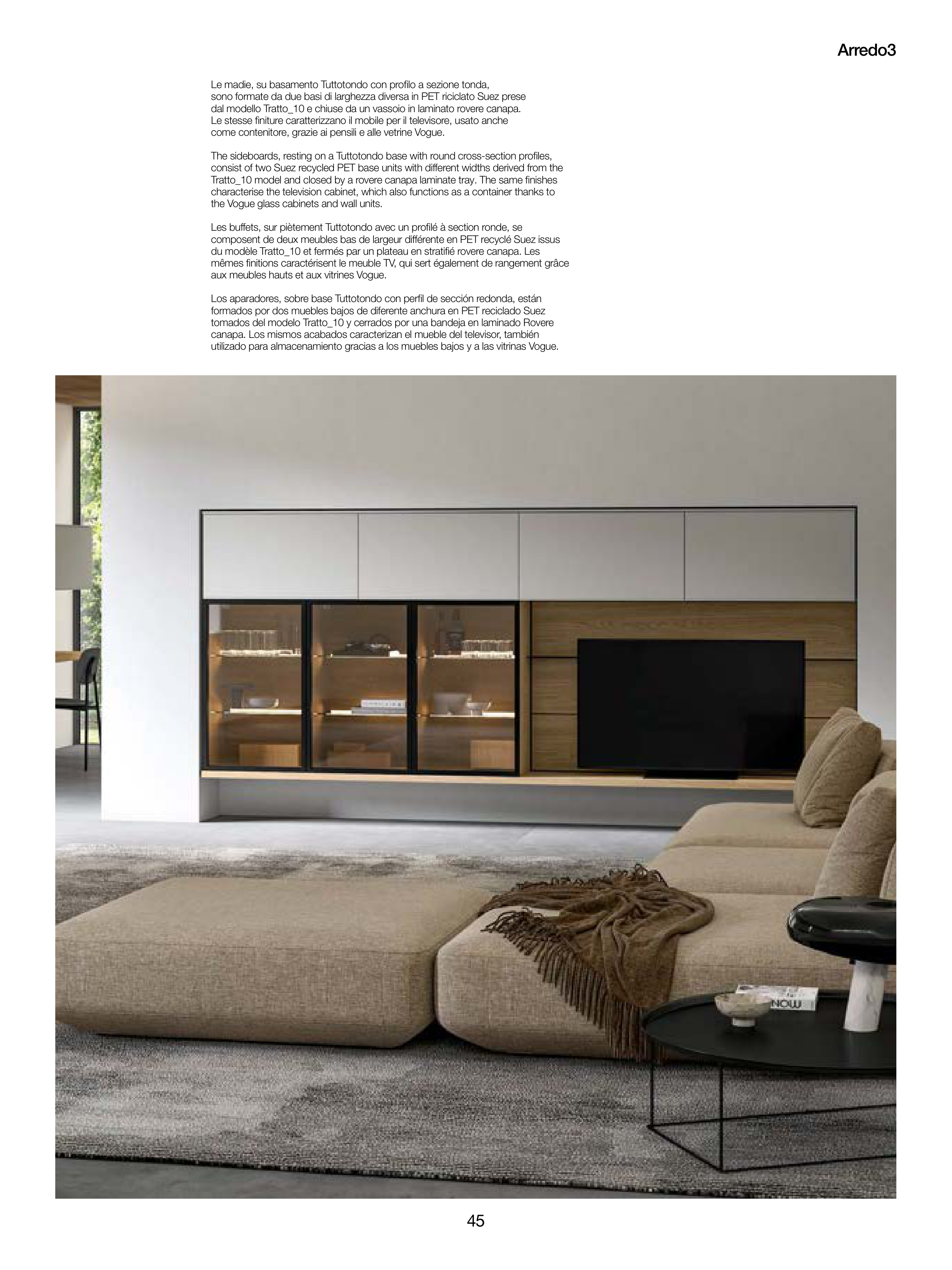 canapa. Los mismos acabados caracterizan el mueble del televisor, también