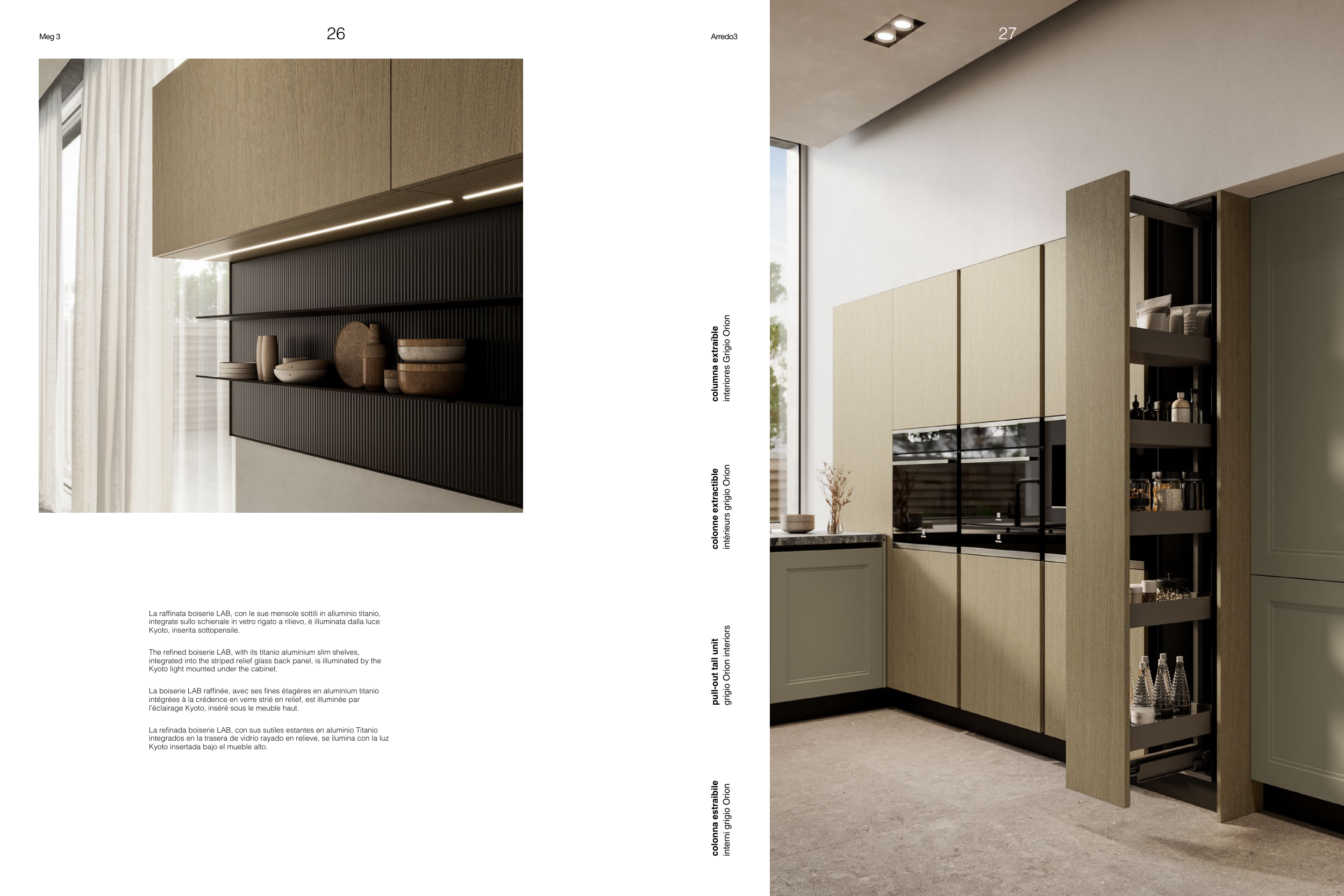 The refined boiserie LAB, with its titanio aluminium slim shelves,