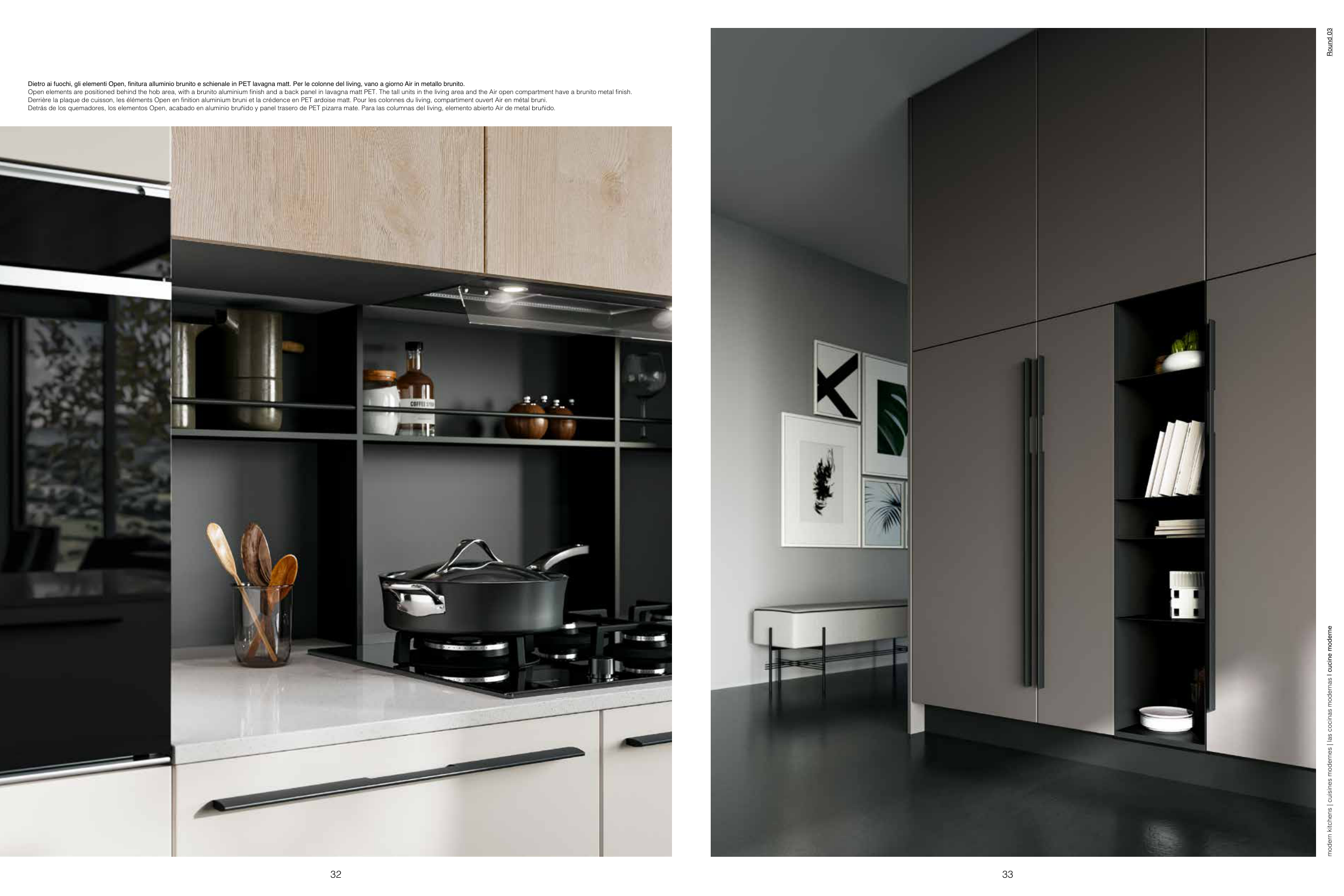 Dietro ai fuochi, gli elementi Open, finitura alluminio brunito e schienale in PET lavagna matt. Per le colonne del living, vano a giorno Air in metallo brunito.