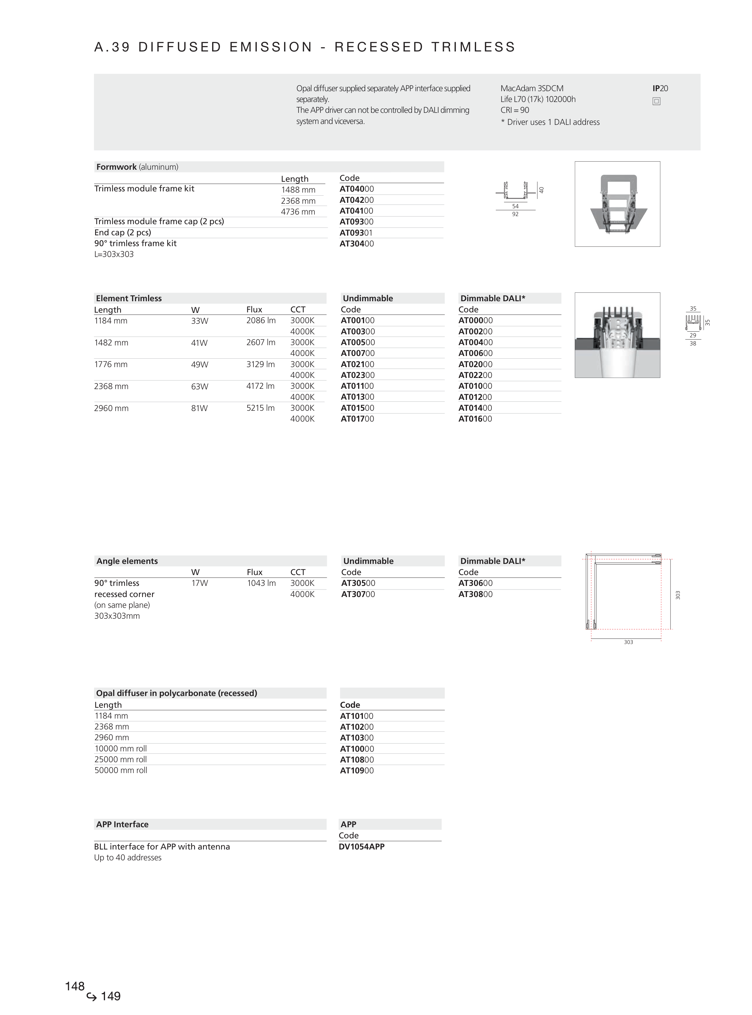 Opal diffuser in polycarbonate (recessed)
