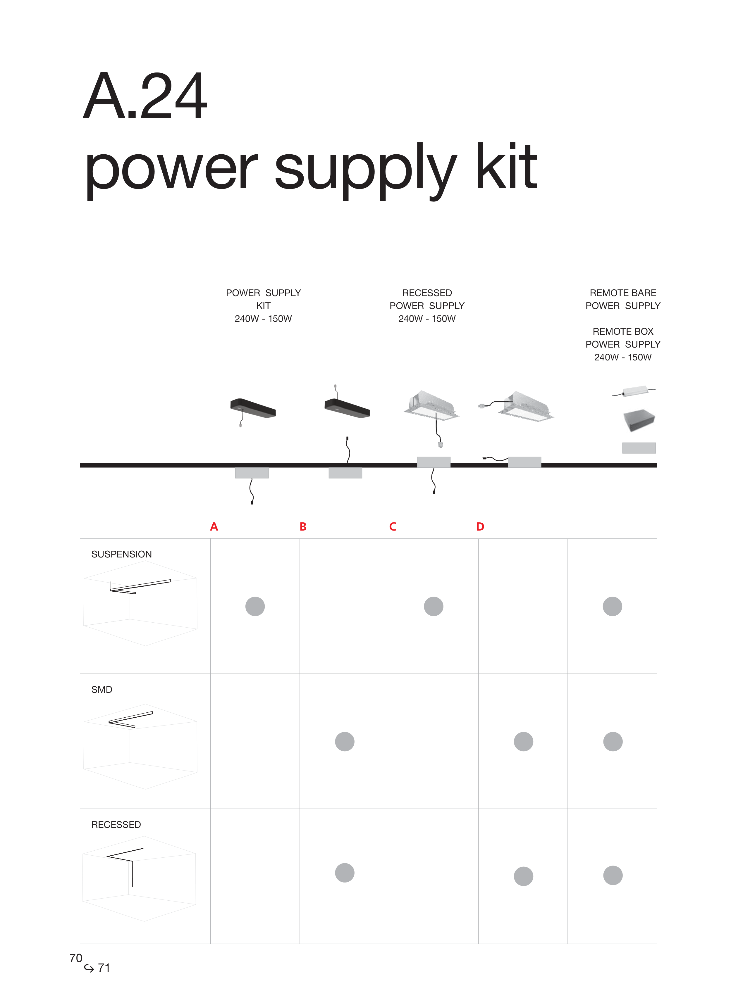 A B C D DIRECT EMISSION with 1 Power Supply tot. 240 W efective 200 W or 150W efective 130W A.24 power supply kit POWER SUPPLY KIT 240W - 150W RECESSED POWER SUPPLY 240W - 150W REMOTE BARE POWER SUPPLY REMOTE BOX POWER SUPPLY 240W - 150W RECESSED SMD SUSPENSION 70 71