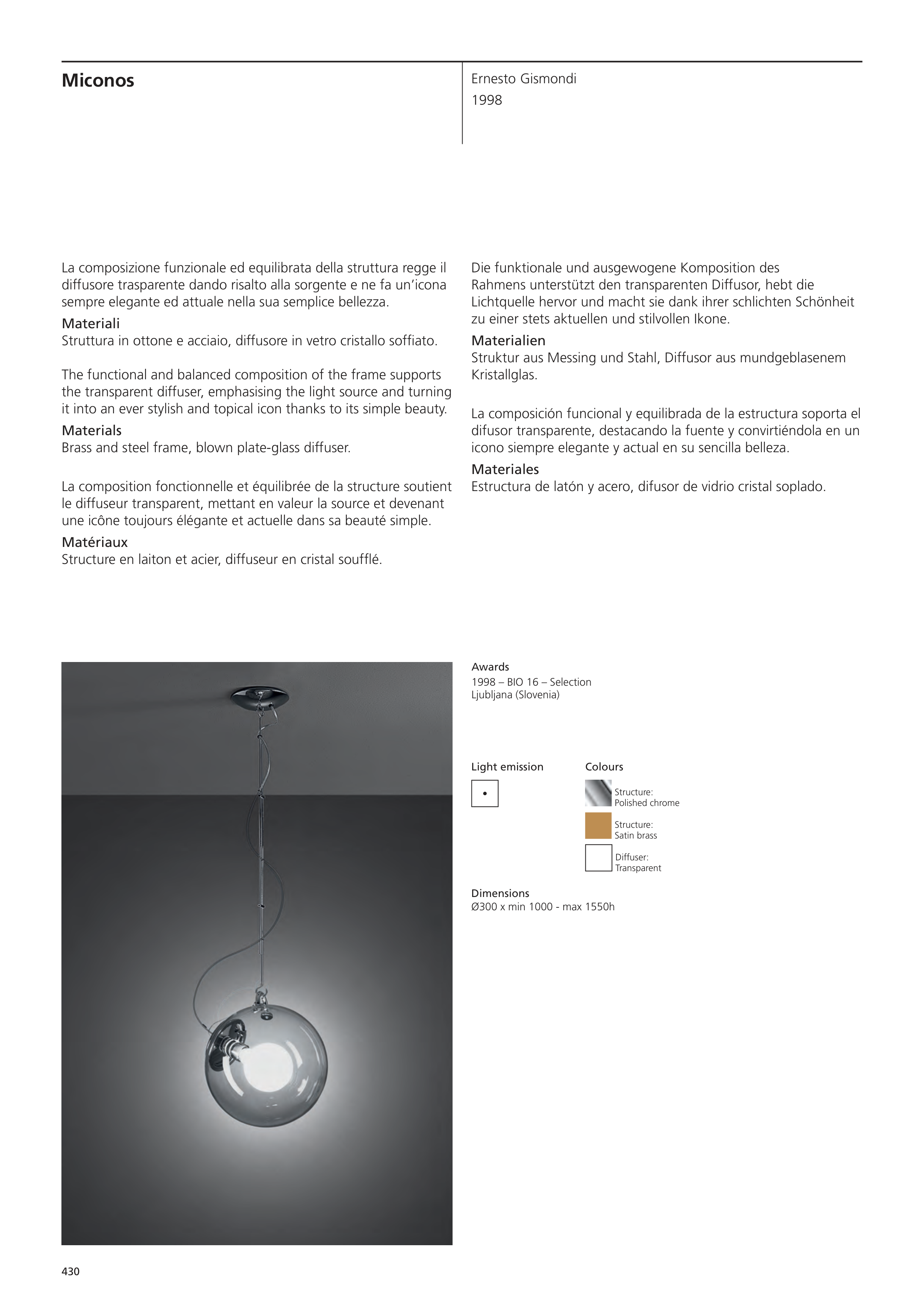 Struttura in ottone e acciaio, diffusore in vetro cristallo soffiato.