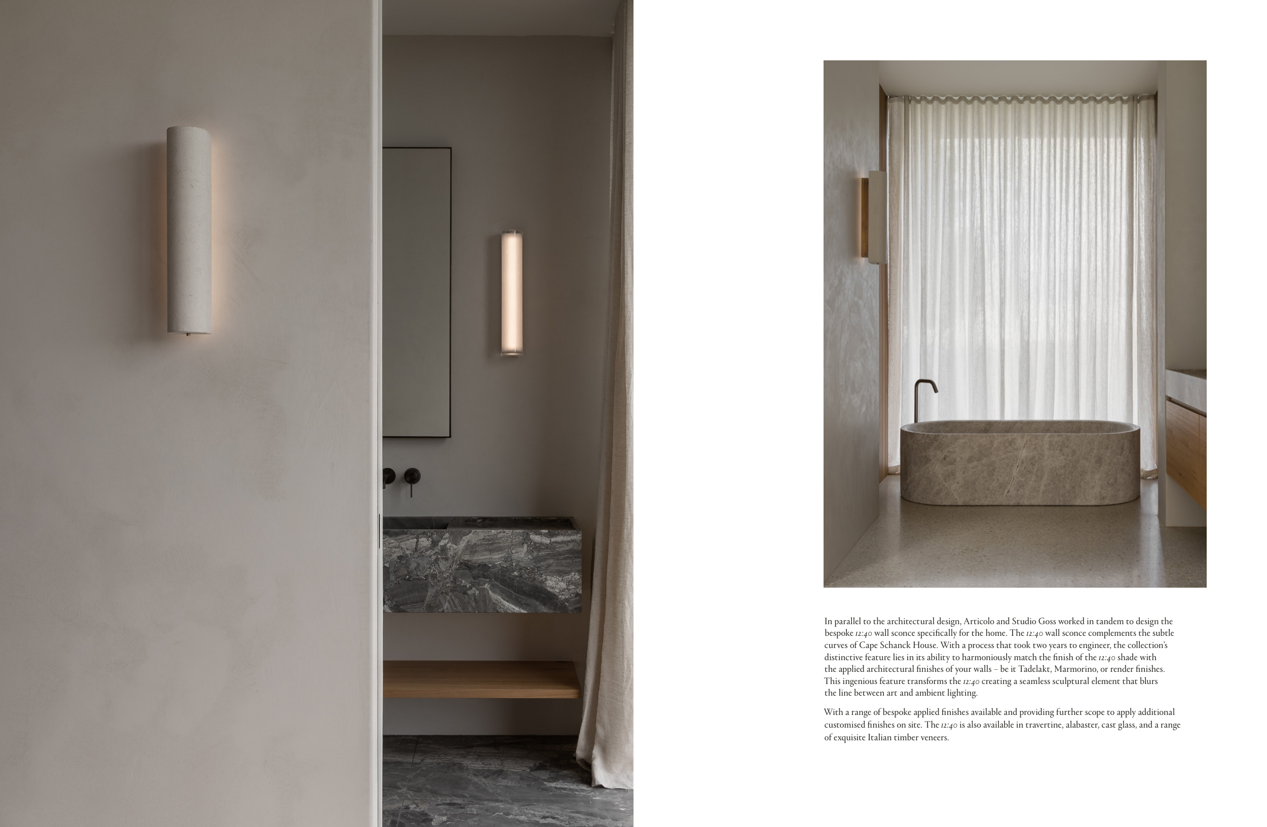 customised finishes on site. The 12:40 is also available in travertine, alabaster, cast glass, and a range