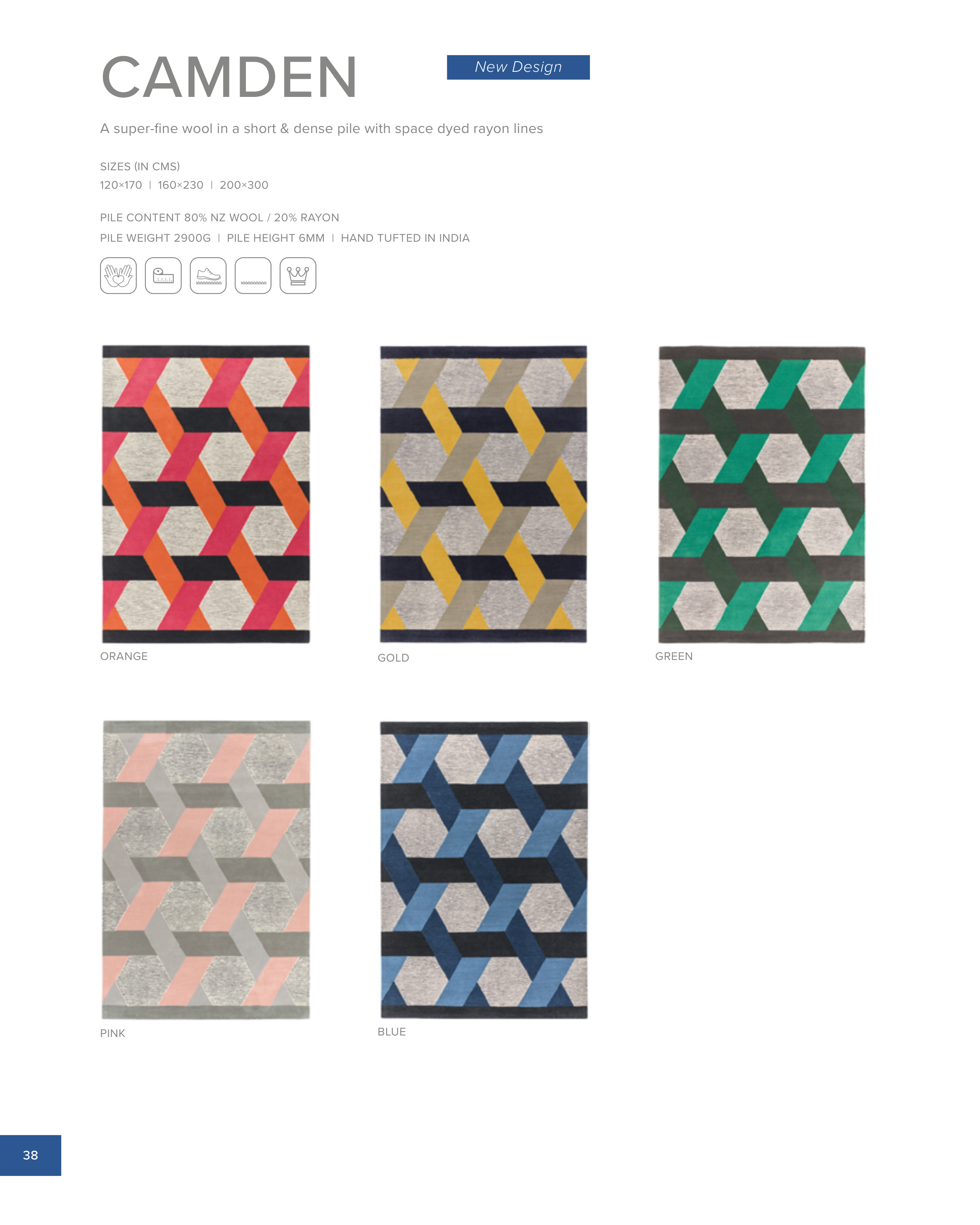 CAMDEN 38 PINK BLUE ORANGE GOLD GREEN A super-fine wool in a short & dense pile with space dyed rayon lines 120×170 | 160×230 | 200×300 SIZES (IN CMS) PILE CONTENT 80% NZ WOOL / 20% RAYON PILE WEIGHT 2900G | PILE HEIGHT 6MM | HAND TUFTED IN INDIA New Design
