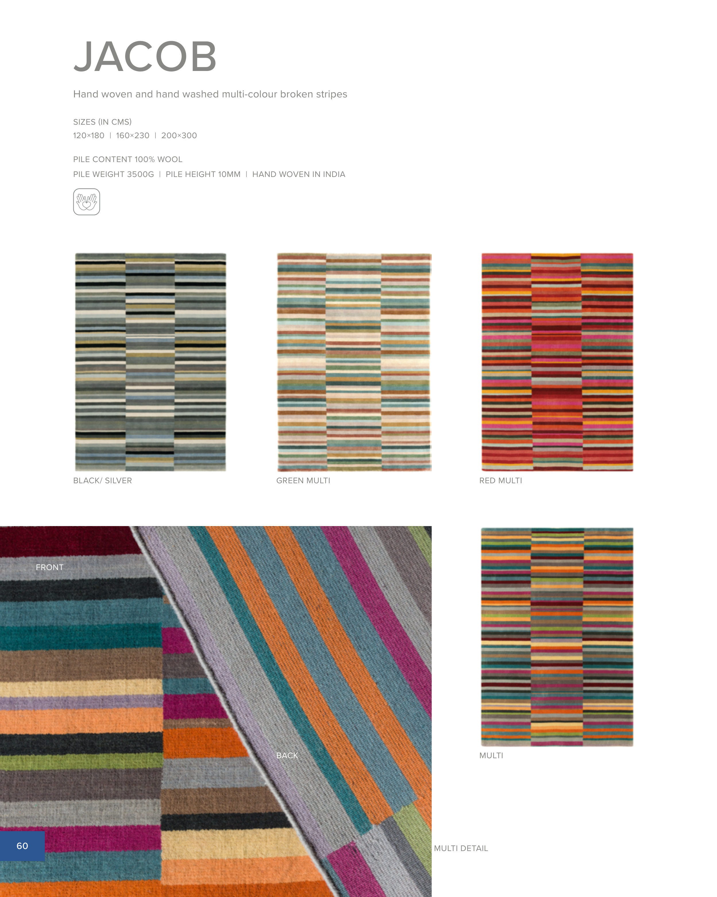 JACOB 60 RED MULTI BLACK/ SILVER GREEN MULTI MULTI Hand woven and hand washed multi-colour broken stripes 120×180 | 160×230 | 200×300 SIZES (IN CMS) PILE CONTENT 100% WOOL PILE WEIGHT 3500G | PILE HEIGHT 10MM | HAND WOVEN IN INDIA MULTI DETAIL BACK FRONT