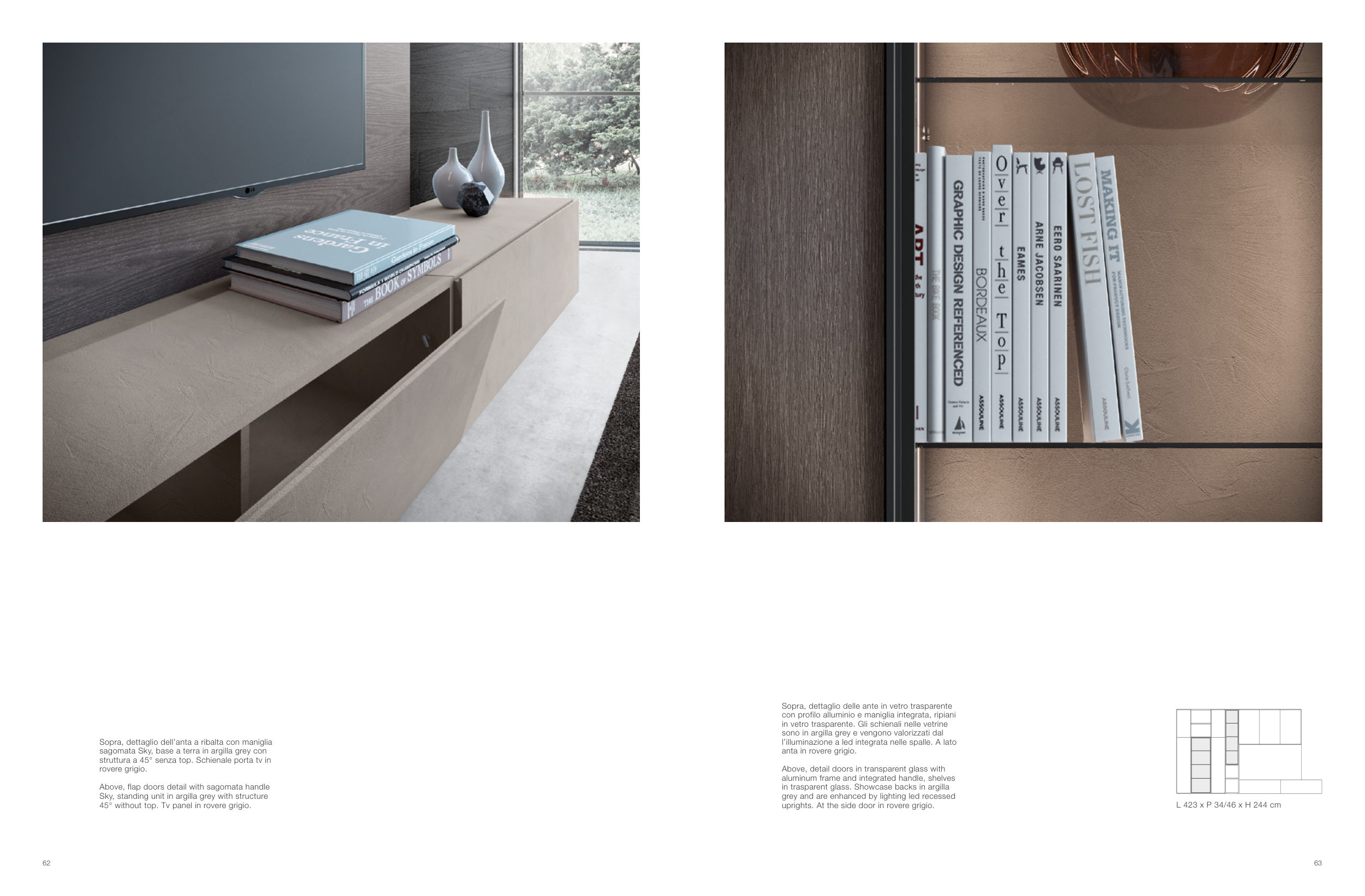 45° without top. Tv panel in rovere grigio.