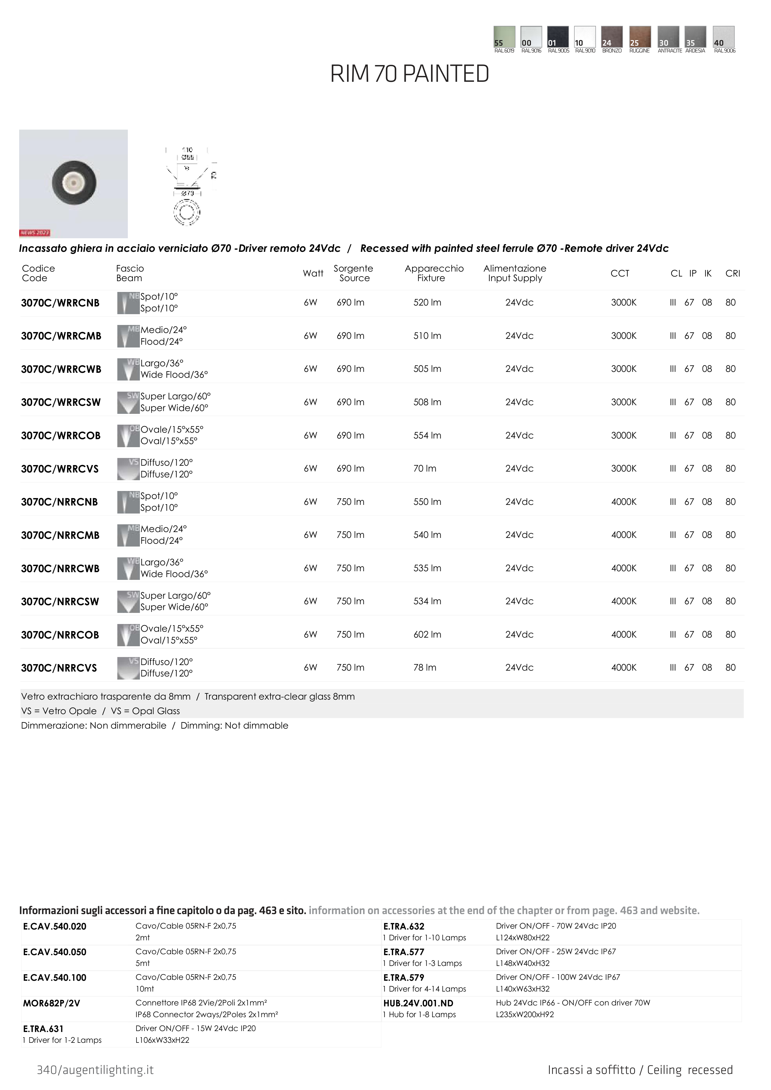 Incassato ghiera in acciaio verniciato Ø70 -Driver remoto 24Vdc / Recessed with painted steel ferrule Ø70 -Remote driver 24Vdc