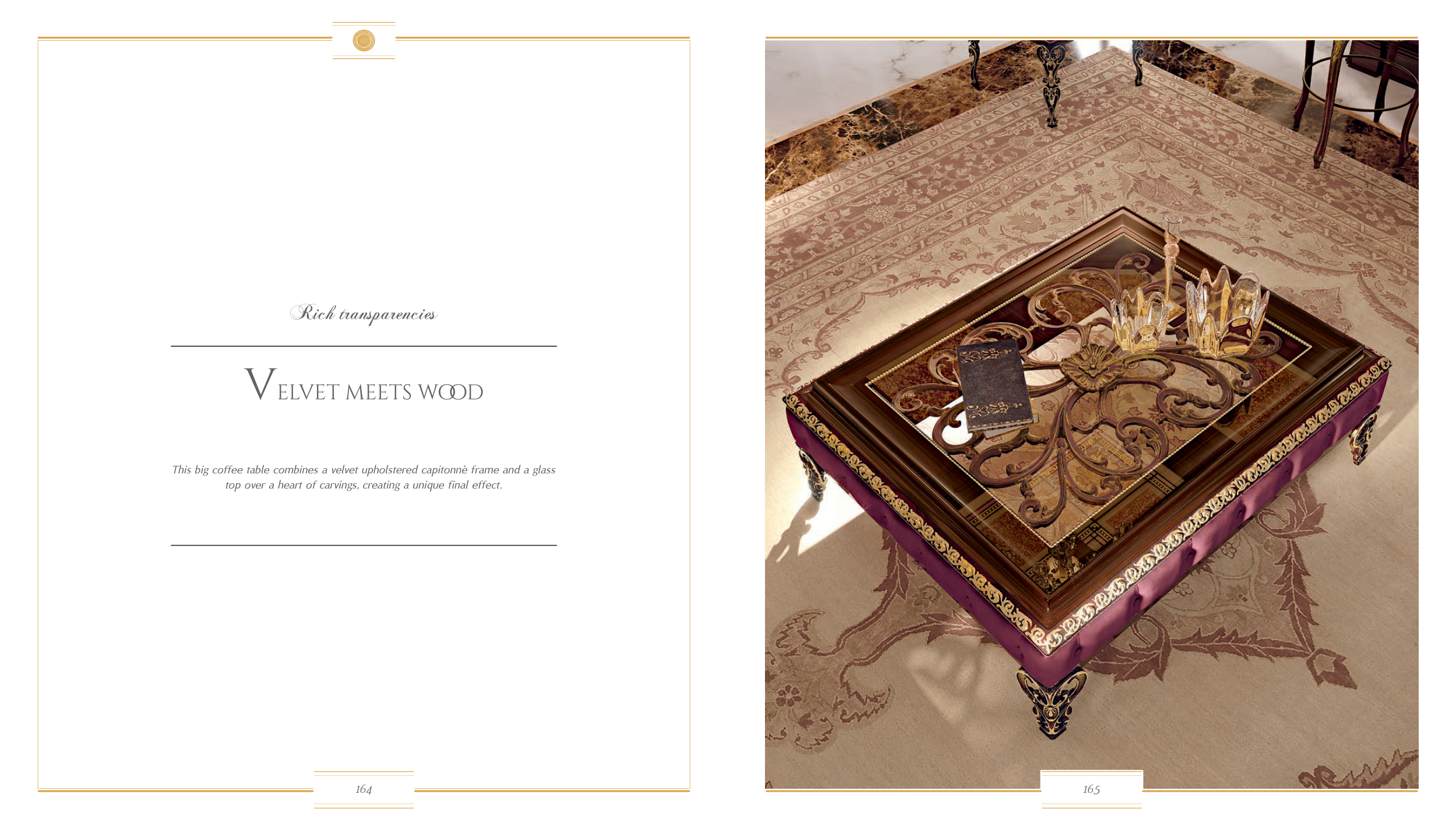 This big coffee table combines a velvet upholstered capitonnè frame and a glass