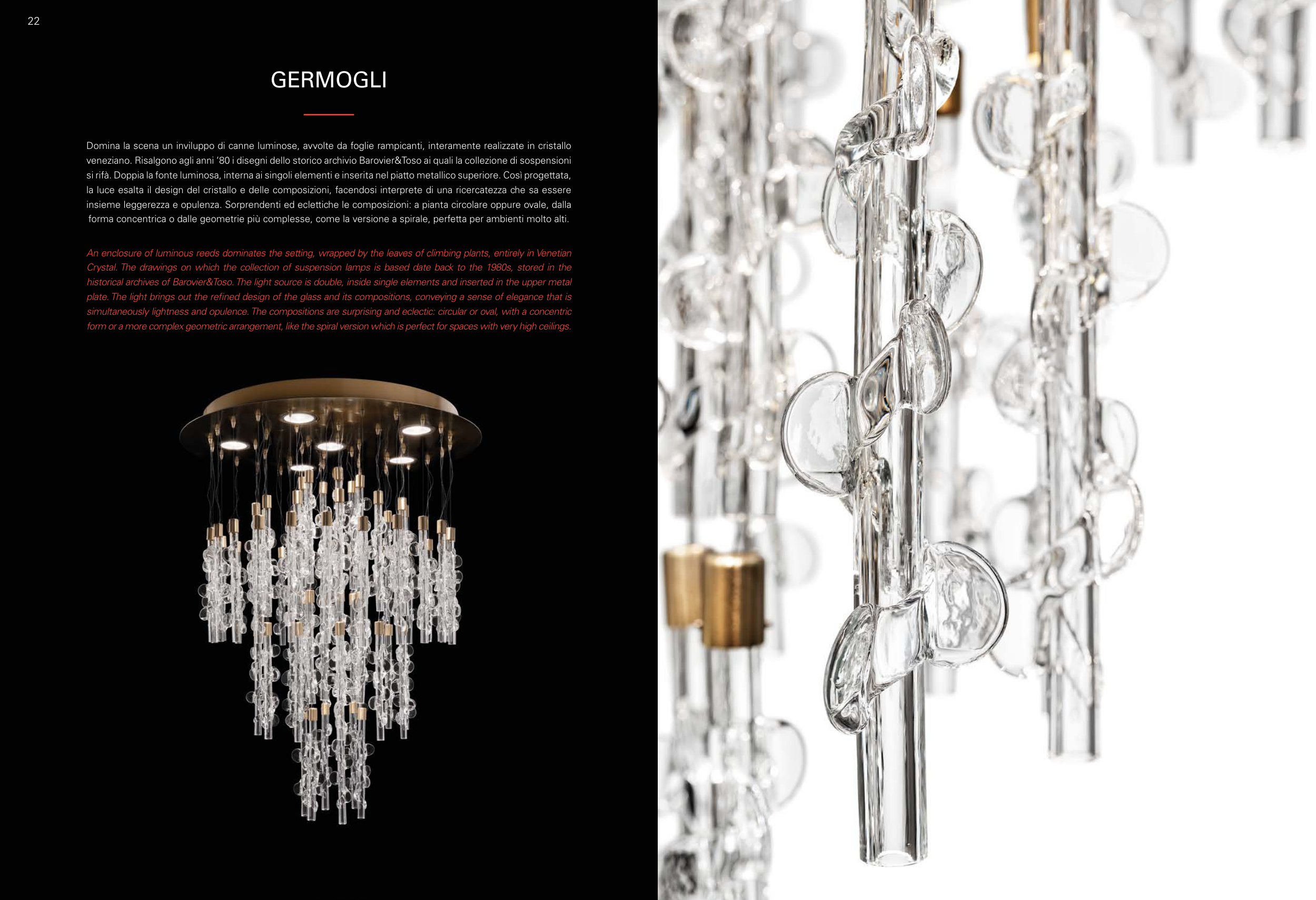 Crystal. The drawings on which the collection of suspension lamps is based date back to the 1980s, stored in the