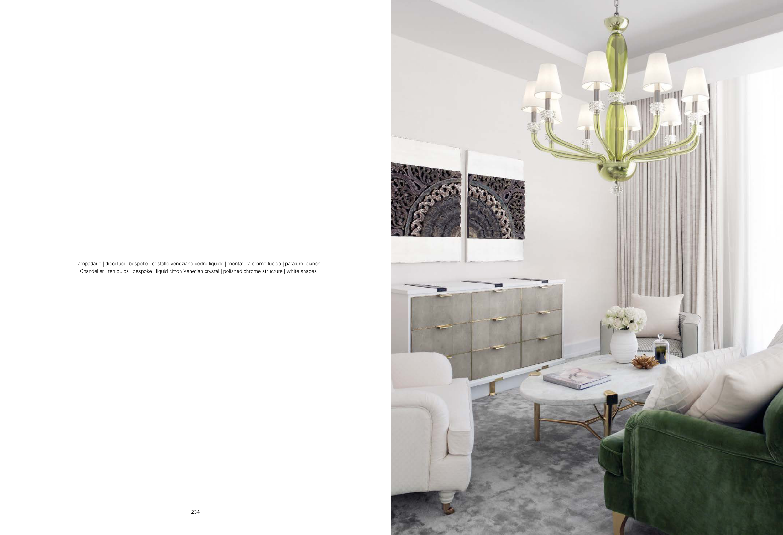 Chandelier | ten bulbs | bespoke | liquid citron Venetian crystal | polished chrome structure | white shades