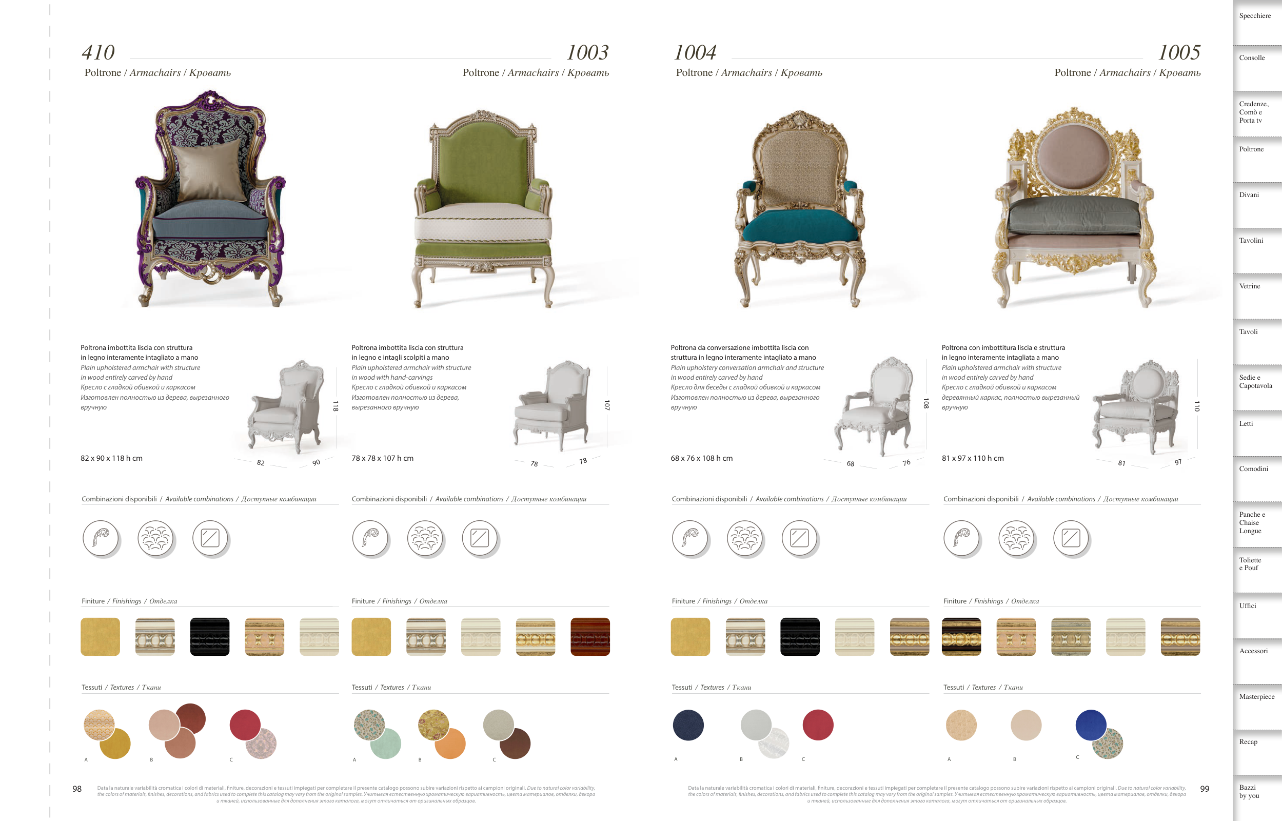 the colors of materials, fnishes, decorations, and fabrics used to complete this catalog may vary from the original samples. Учитывая естественную хроматическую вариативность, цвета материалов, отделки, декора