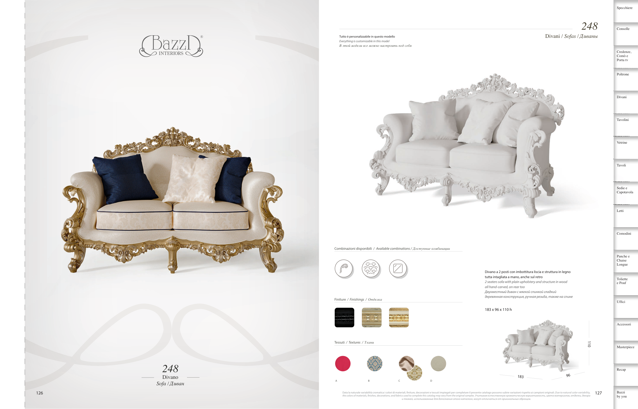 the colors of materials, fnishes, decorations, and fabrics used to complete this catalog may vary from the original samples. Учитывая естественную хроматическую вариативность, цвета материалов, отделки, декора