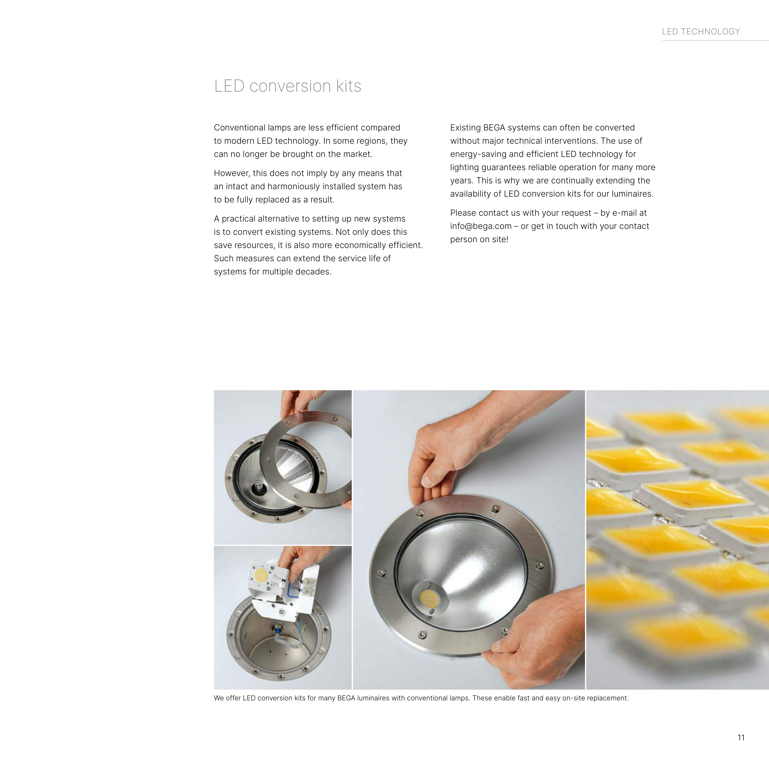 We offer LED conversion kits for many BEGA luminaires with conventional lamps. These enable fast and easy on-site replacement.