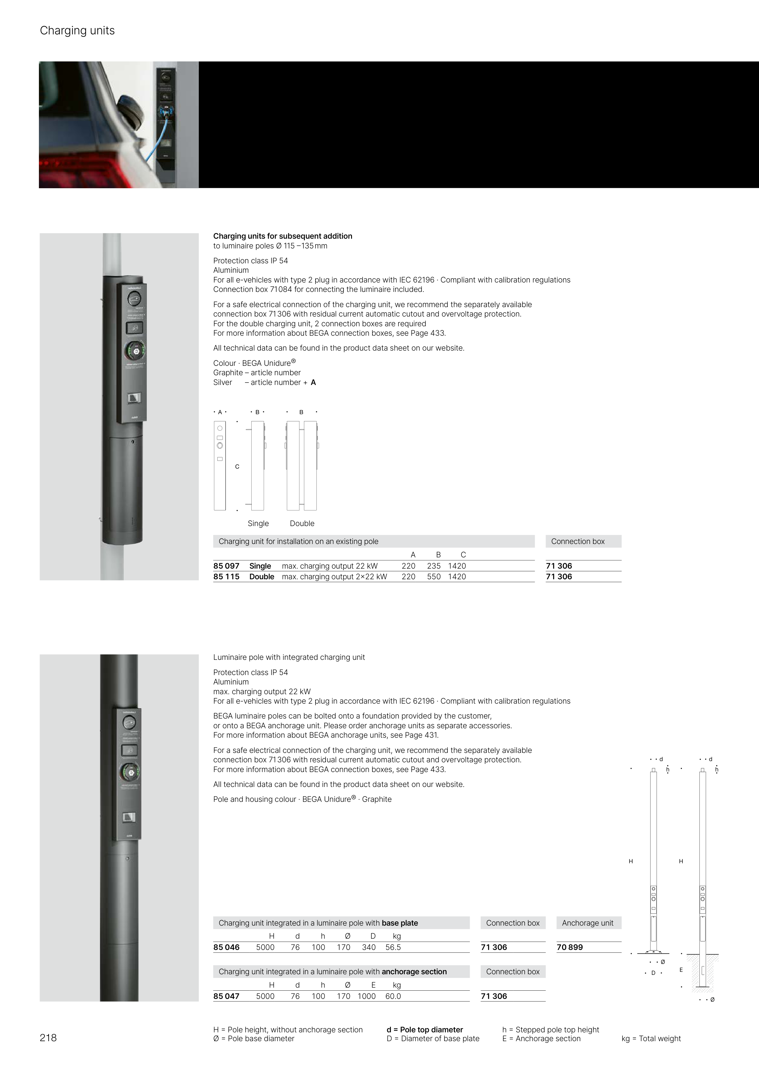 Charging unit integrated in a luminaire pole with anchorage section
