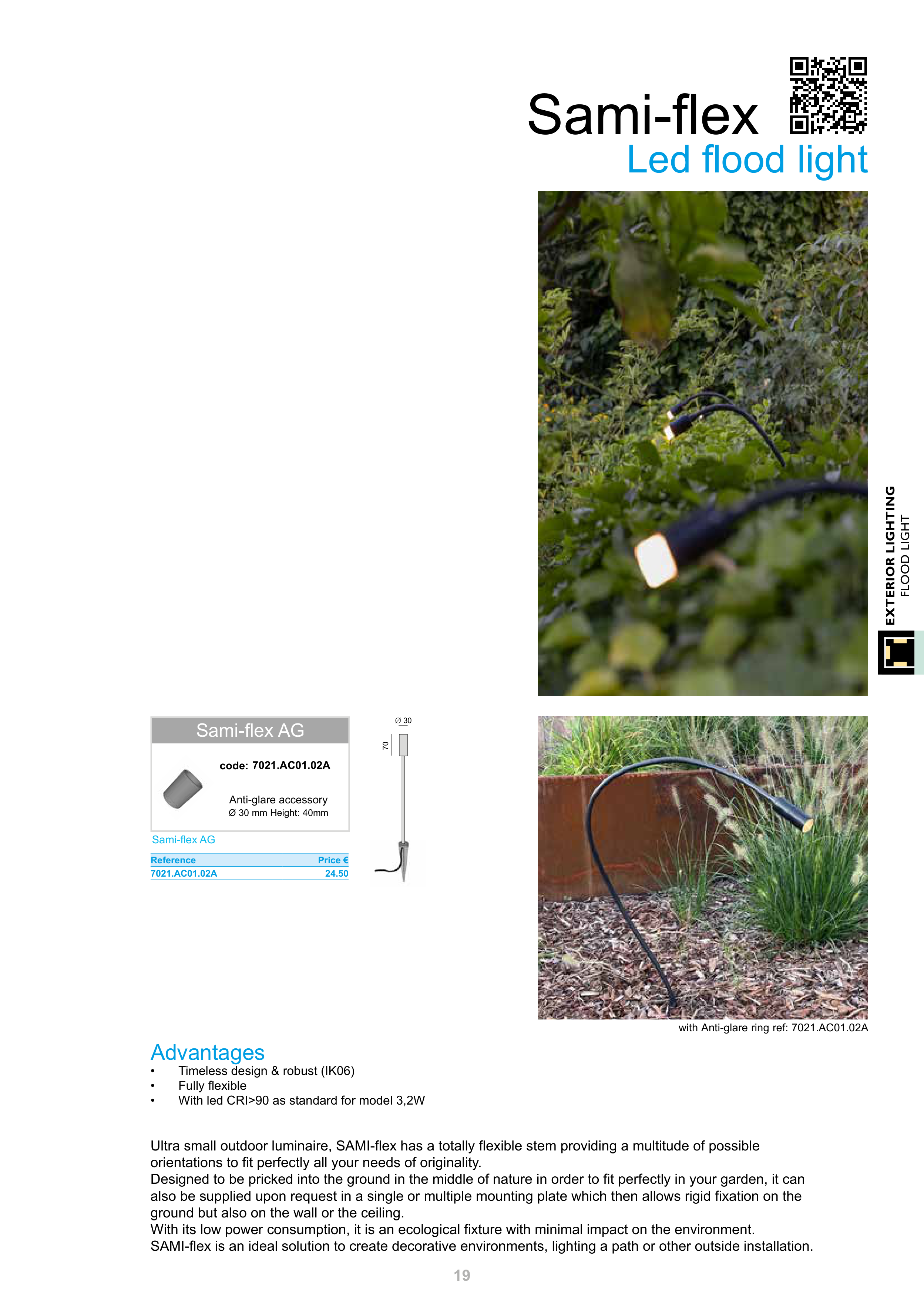 Ultra small outdoor luminaire, SAMI-flex has a totally flexible stem providing a multitude of possible