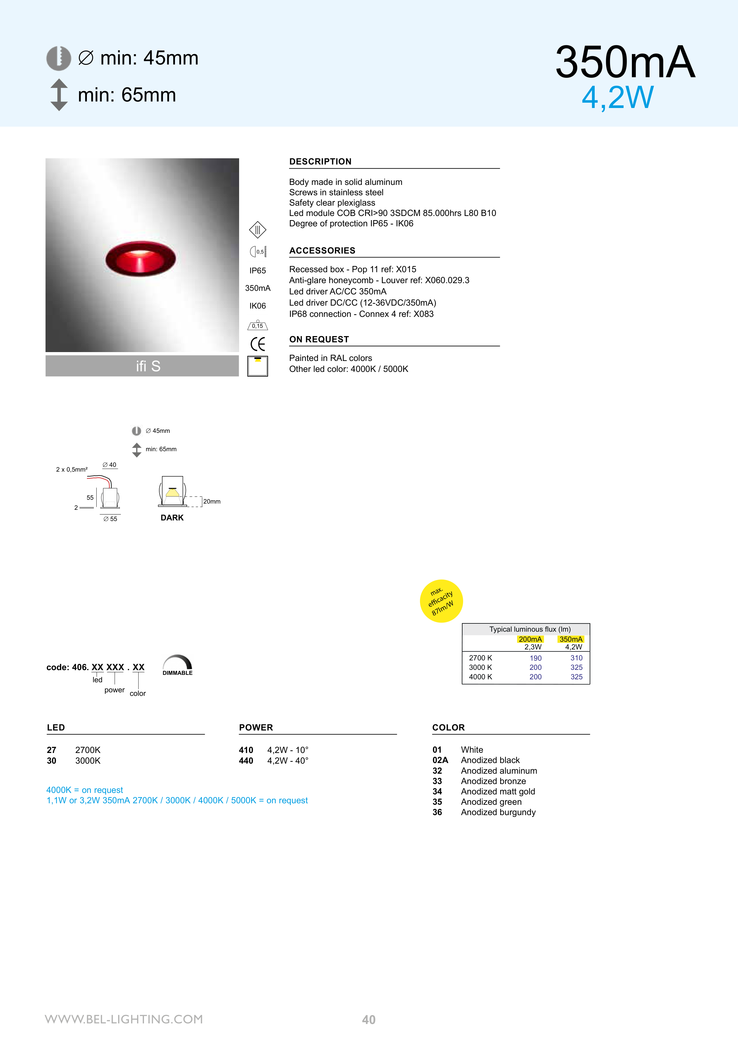 1,1W or 3,2W 350mA 2700K / 3000K / 4000K / 5000K = on request