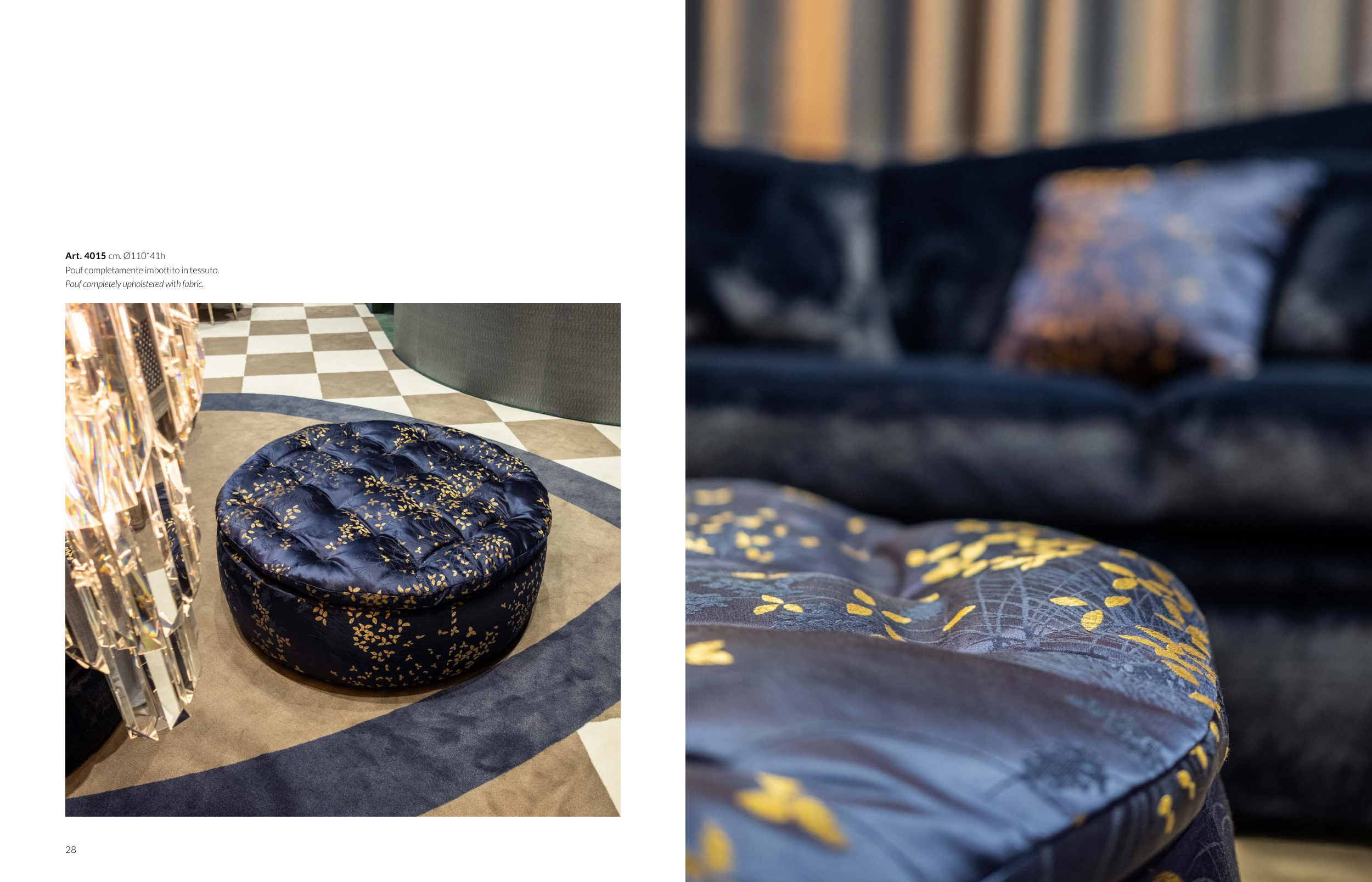 Pouf completely upholstered with fabric.