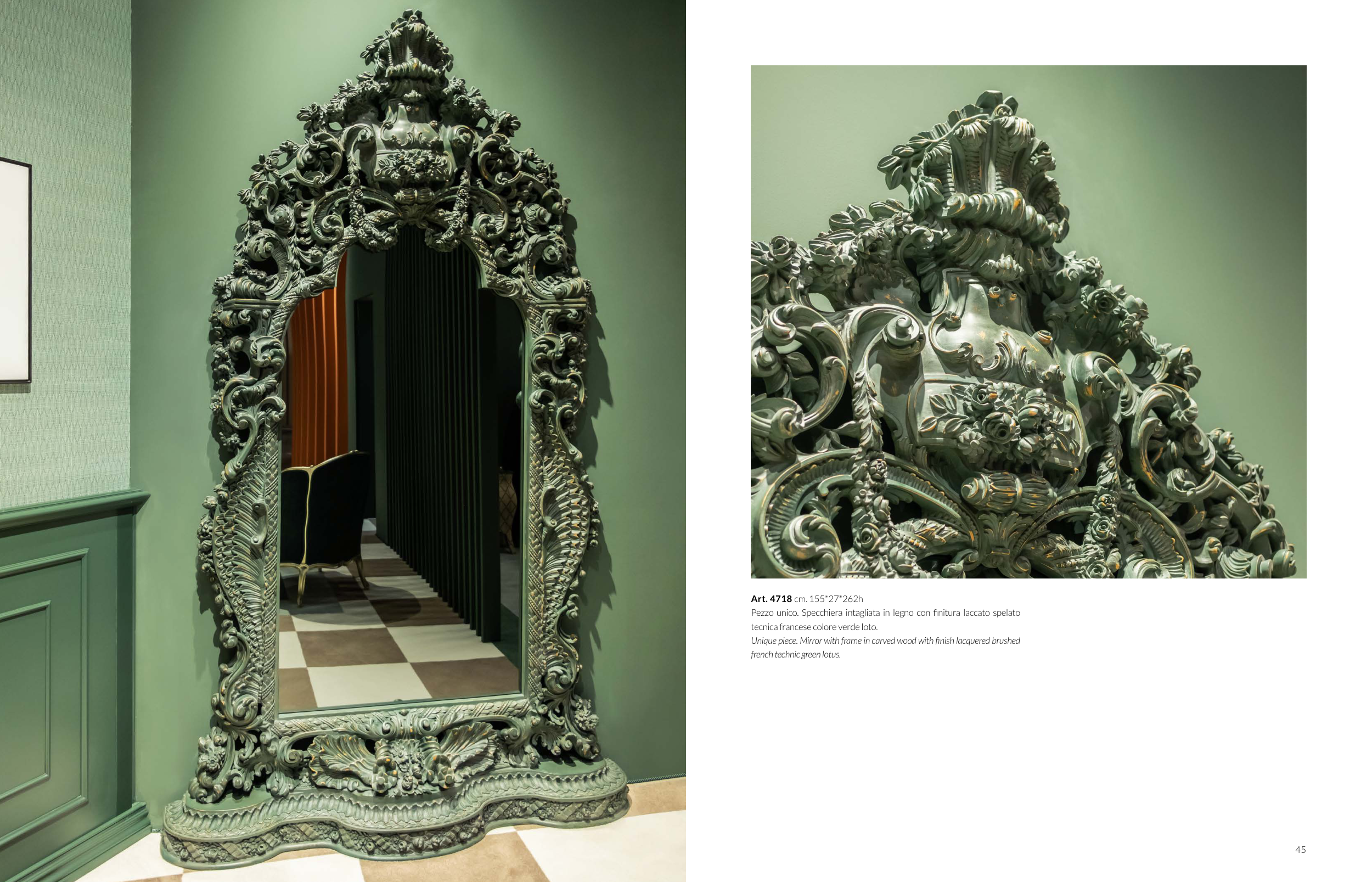 Pezzo unico. Specchiera intagliata in legno con finitura laccato spelato