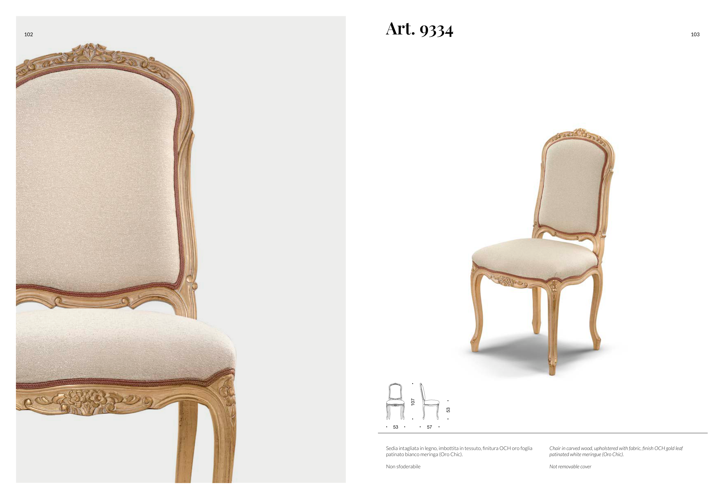 Sedia intagliata in legno, imbottita in tessuto, finitura OCH oro foglia