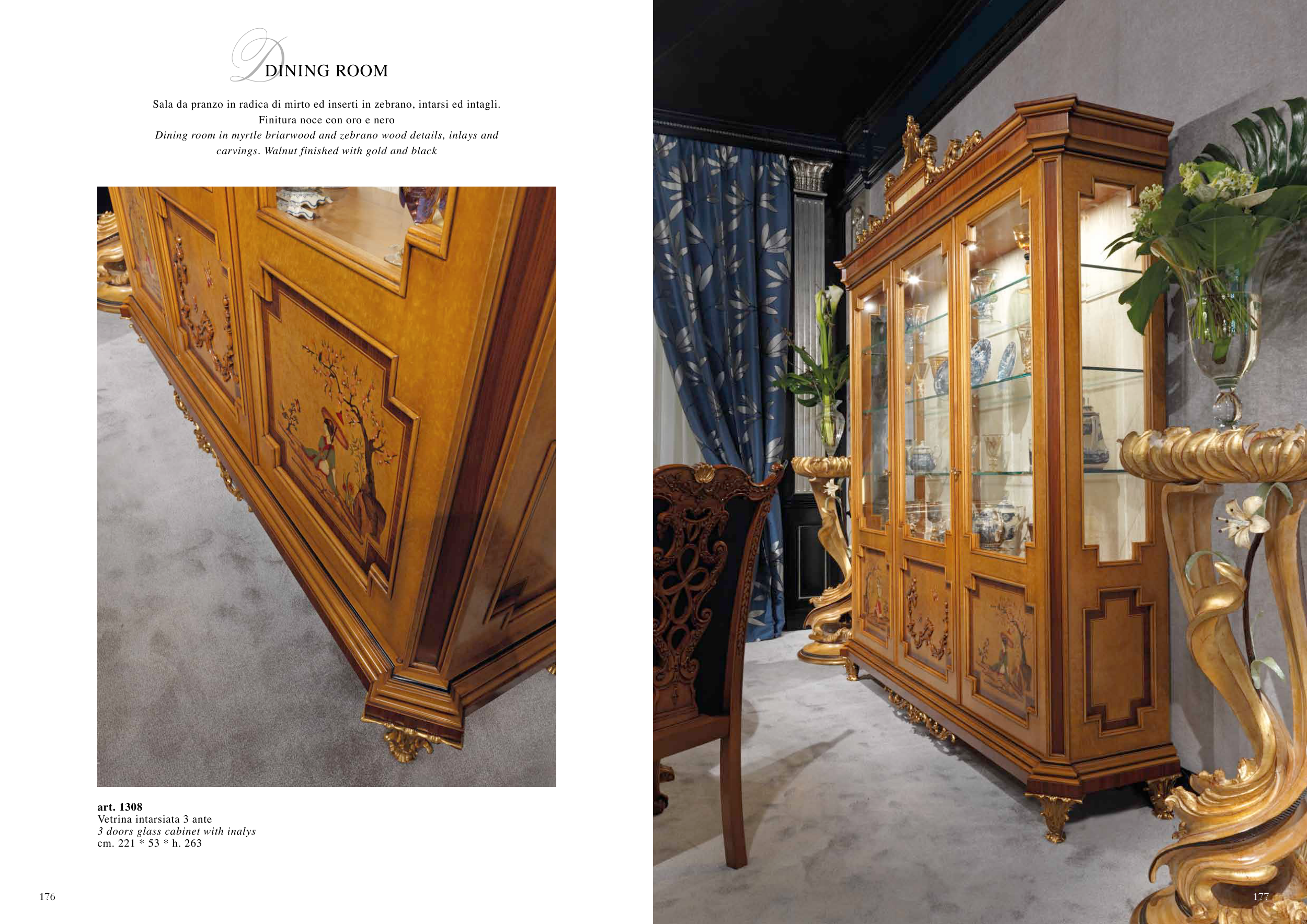 Dining room in myrtle briarwood and zebrano wood details, inlays and
