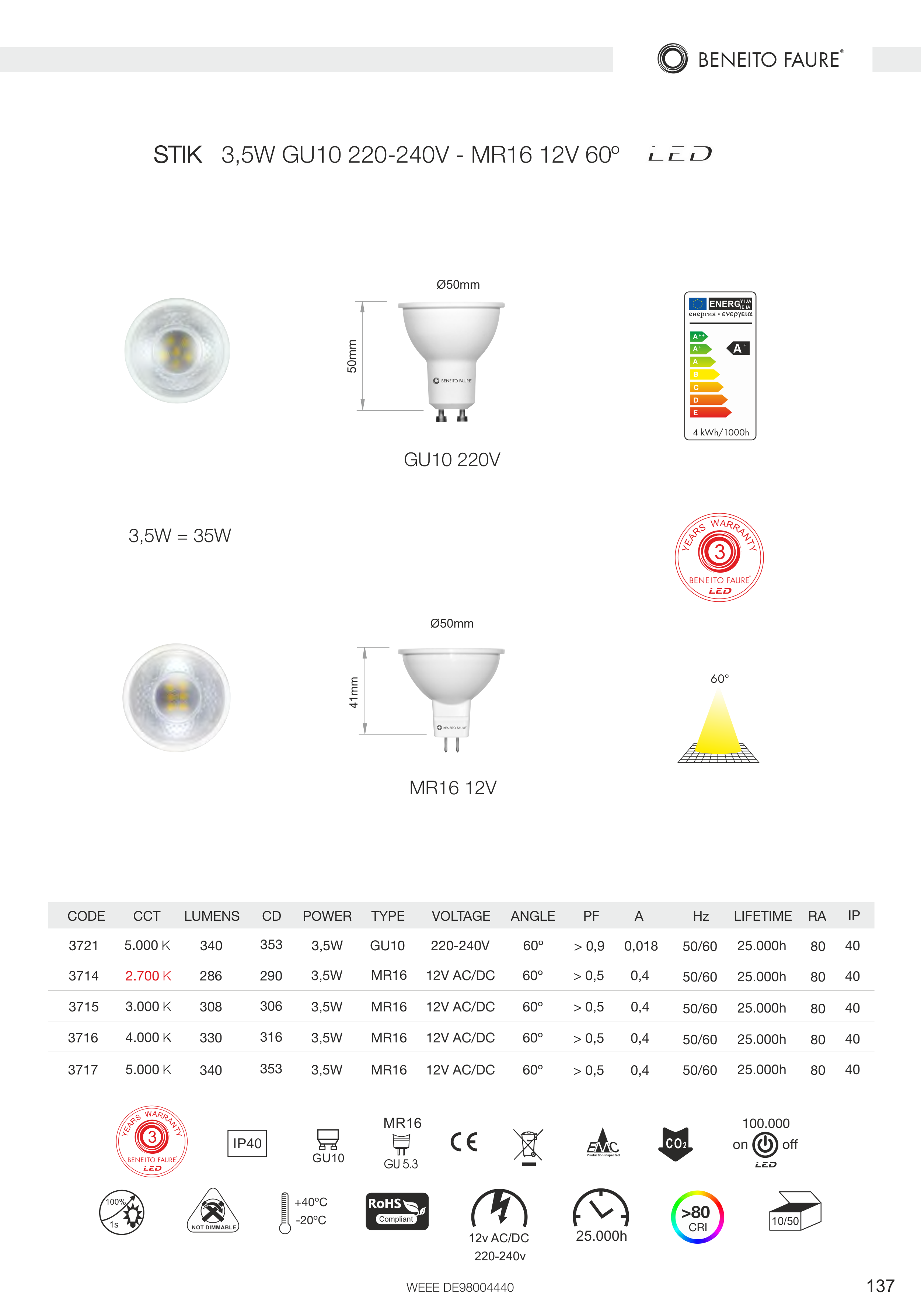 STIK 3,5W GU10 220-240V - MR16 12V 60º