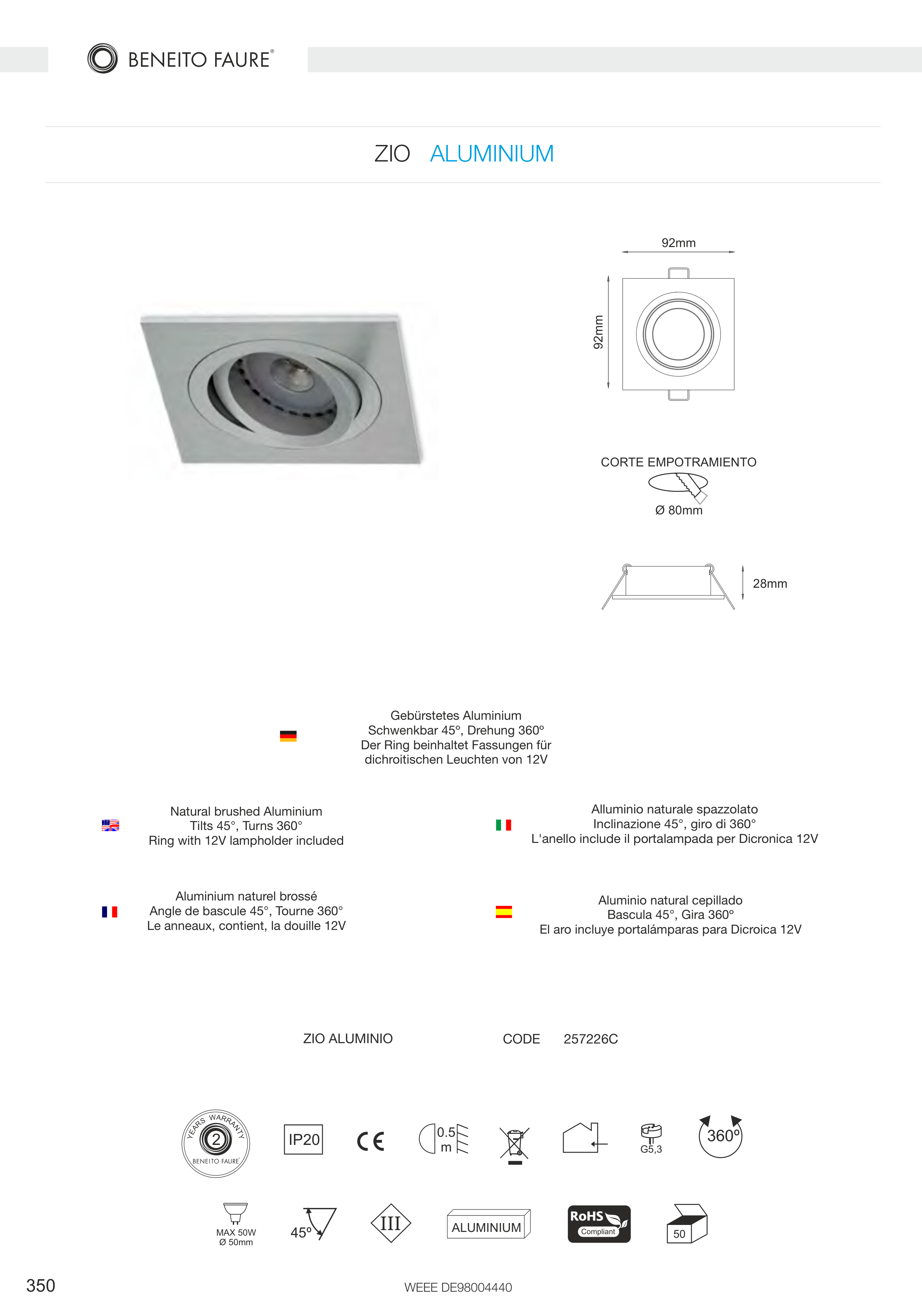 El aro incluye portalámparas para Dicroica 12V