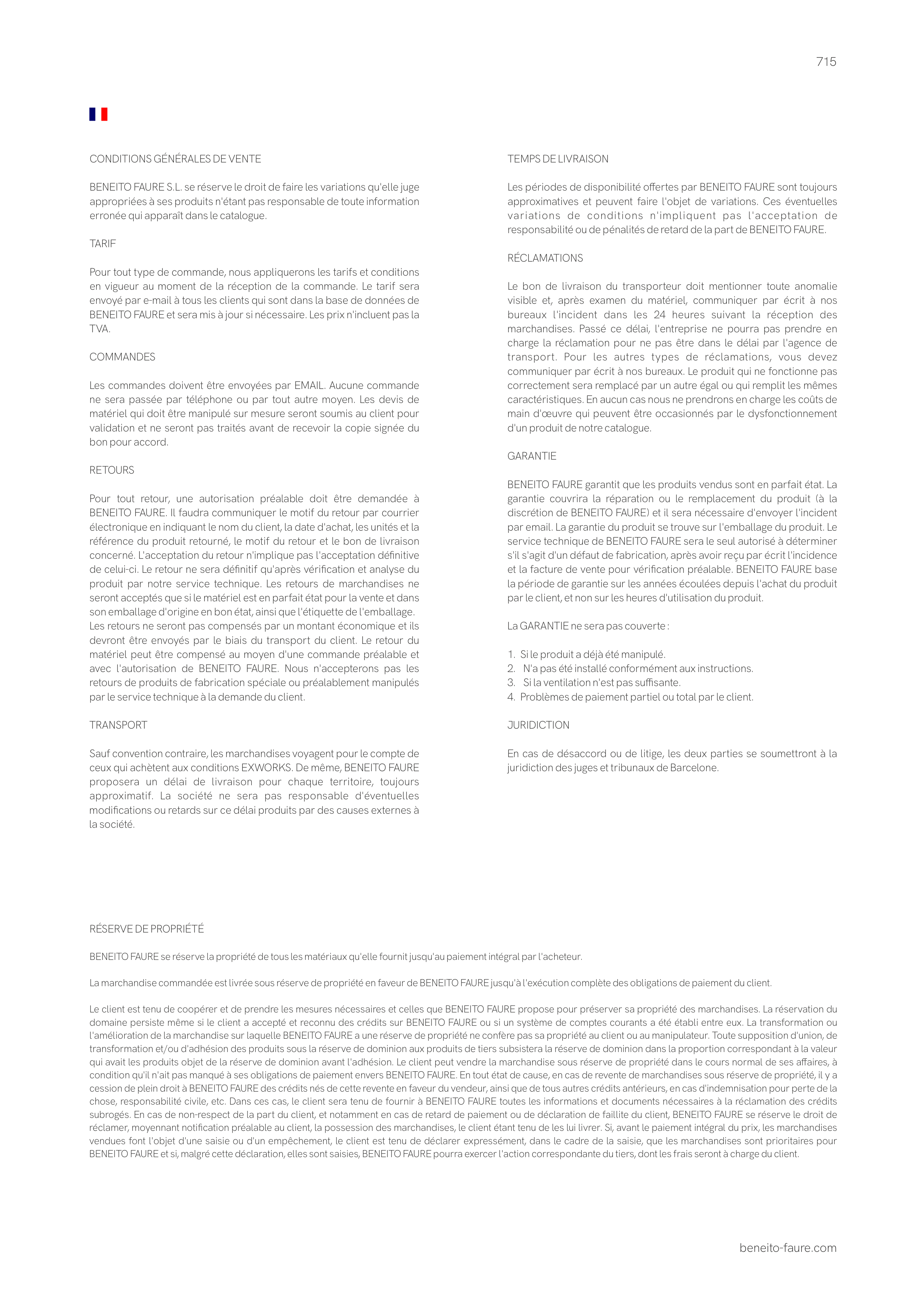 La marchandise commandée est livrée sous réserve de propriété en faveur de BENEITO FAURE jusqu'à l'exécution complète des obligations de paiement du client.