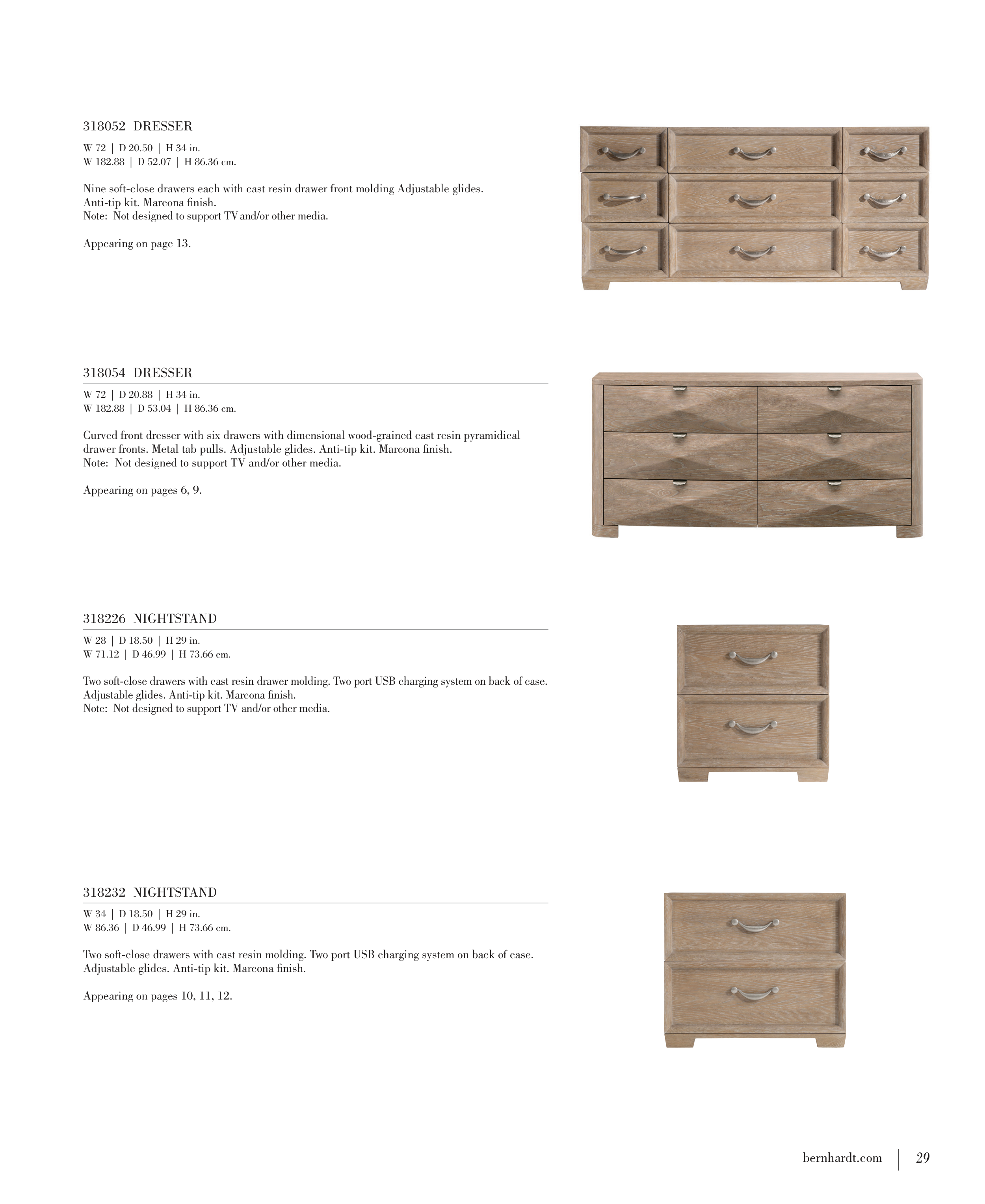 drawer fronts. Metal tab pulls. Adjustable glides. Anti-tip kit. Marcona finish.