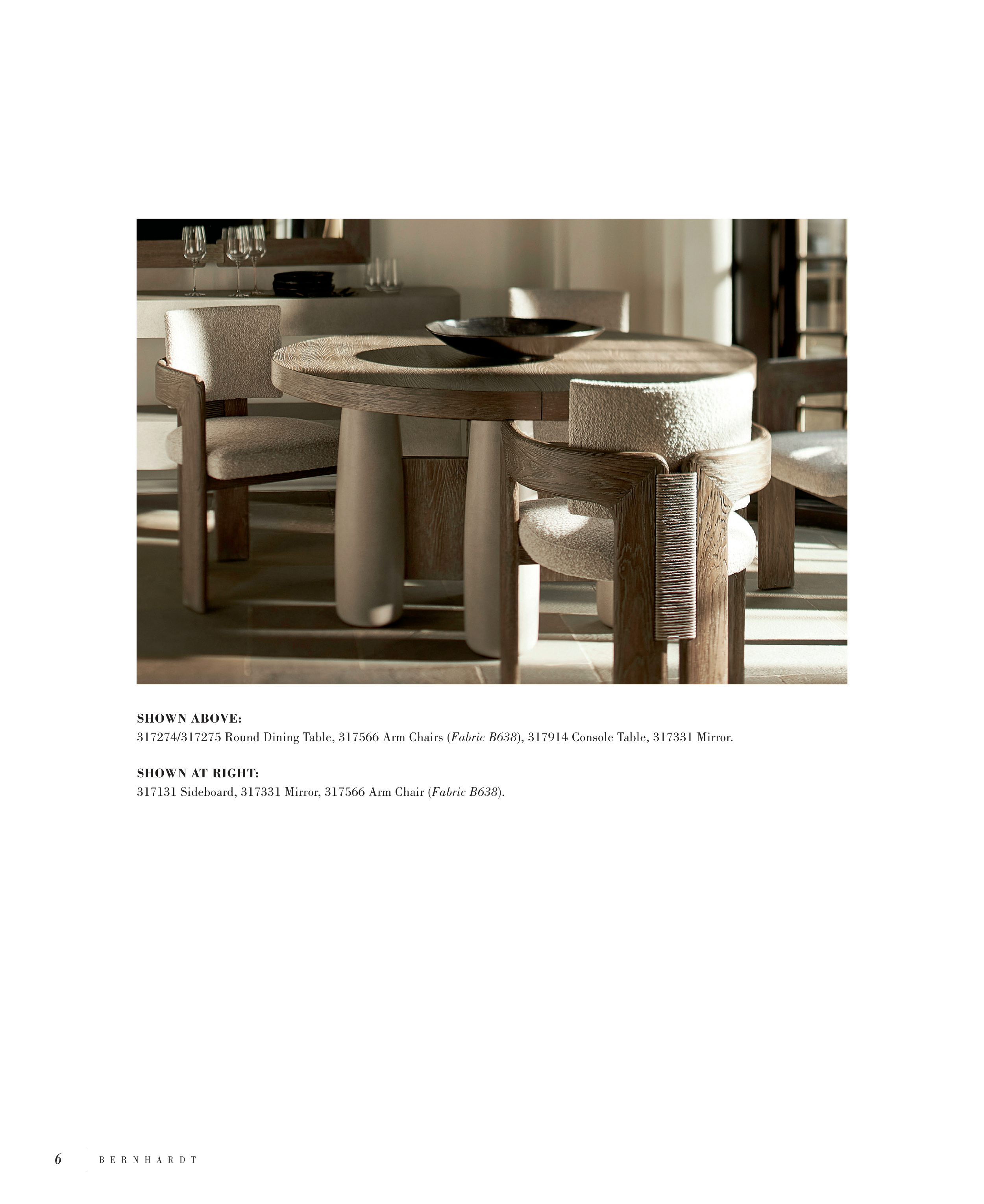 317274/317275 Round Dining Table, 317566 Arm Chairs (Fabric B638), 317914 Console Table, 317331 Mirror.