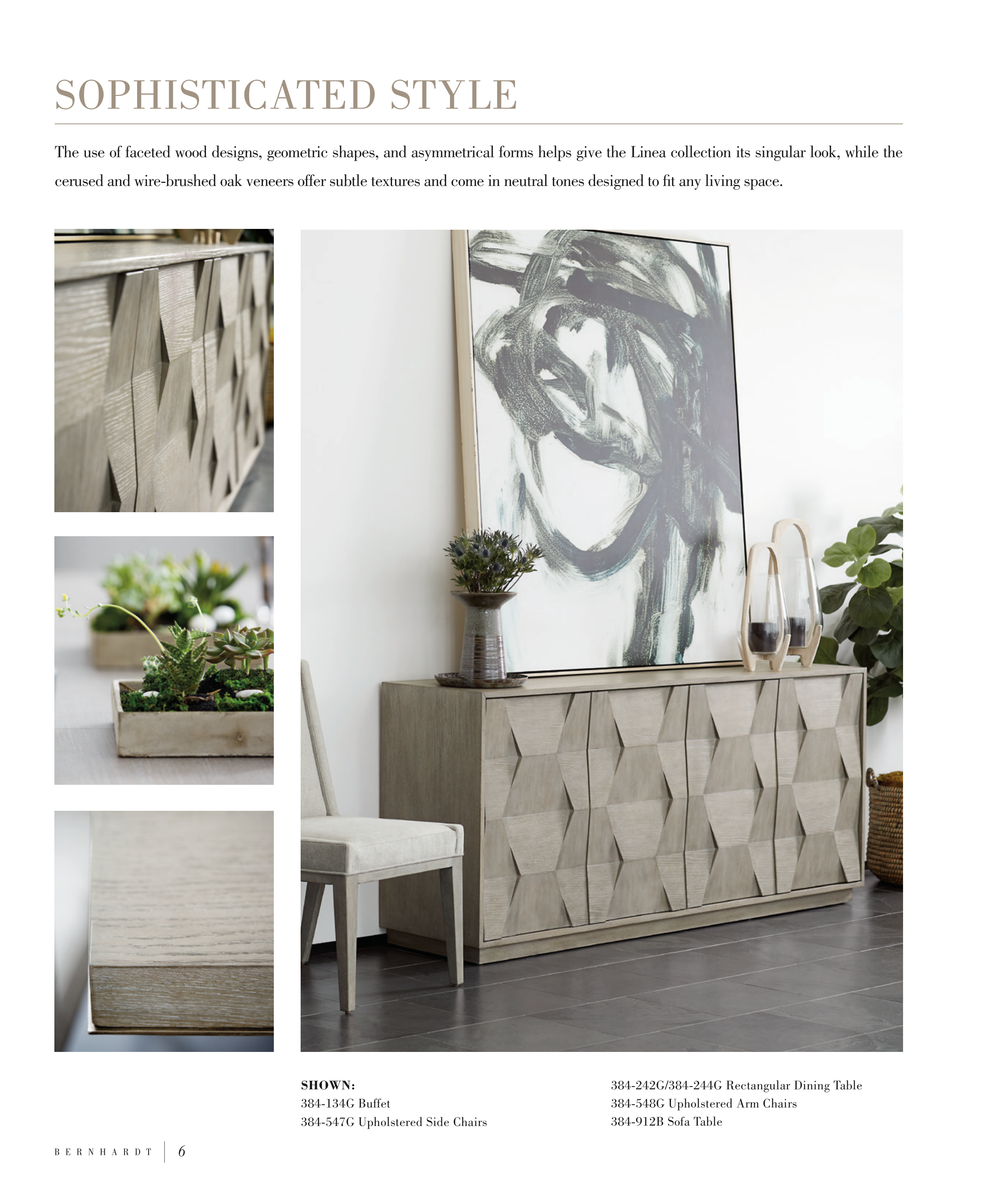 The use of faceted wood designs, geometric shapes, and asymmetrical forms helps give the Linea collection its singular look, while the