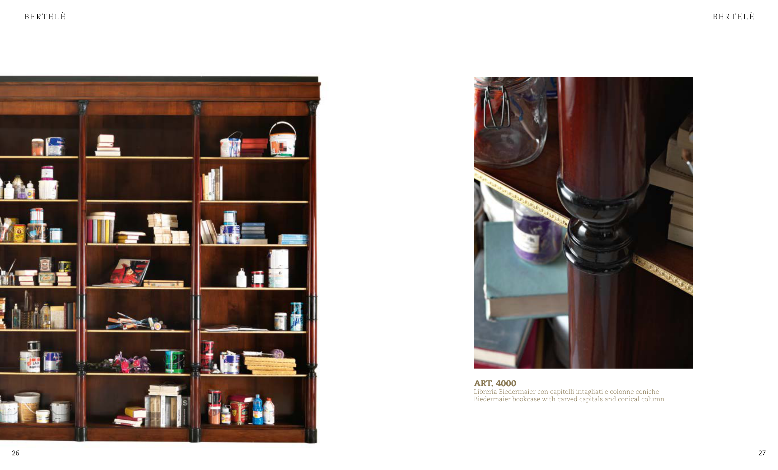 Libreria Biedermaier con capitelli intagliati e colonne coniche