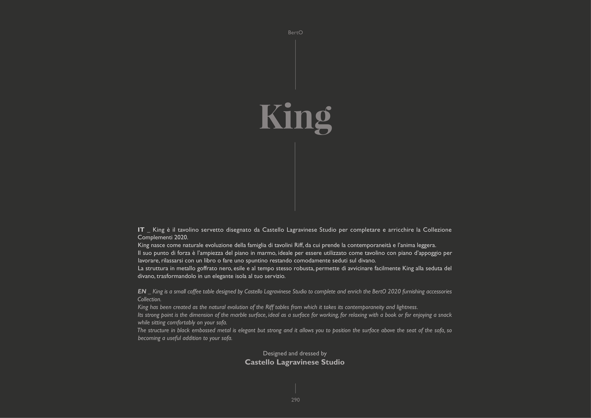 EN _ King is a small coffee table designed by Castello Lagravinese Studio to complete and enrich the BertO 2020 furnishing accessories