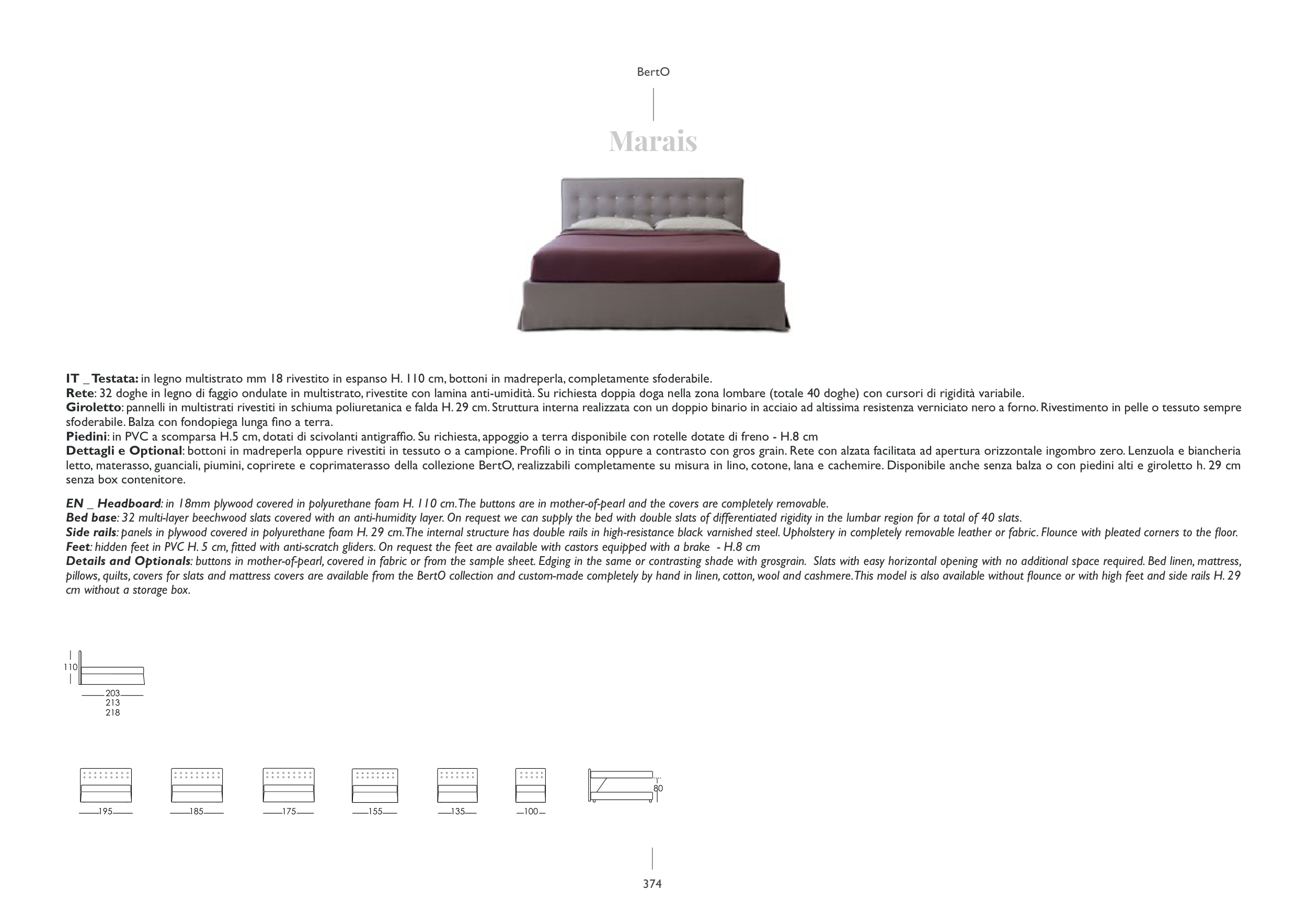 IT _ Testata: in legno multistrato mm 18 rivestito in espanso H. 110 cm, bottoni in madreperla, completamente sfoderabile.
