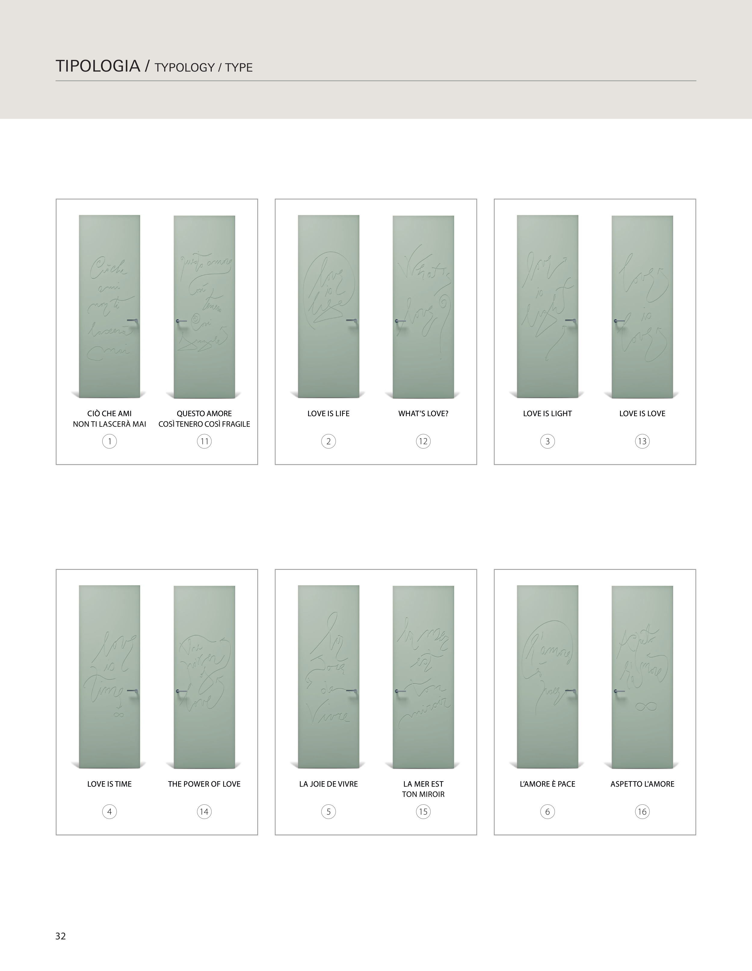 32 TIPOLOGIA / TYPOLOGY / TYPE CIÒ CHE AMI NON TI LASCERÀ MAI QUESTO AMORE COSÌ TENERO COSÌ FRAGILE LOVE IS LIFE WHAT’S LOVE? LOVE IS LOVE LOVE IS TIME THE POWER OF LOVE LA JOIE DE VIVRE LA MER EST TON MIROIR L’AMORE È PACE ASPETTO L'AMORE LOVE IS LIGHT