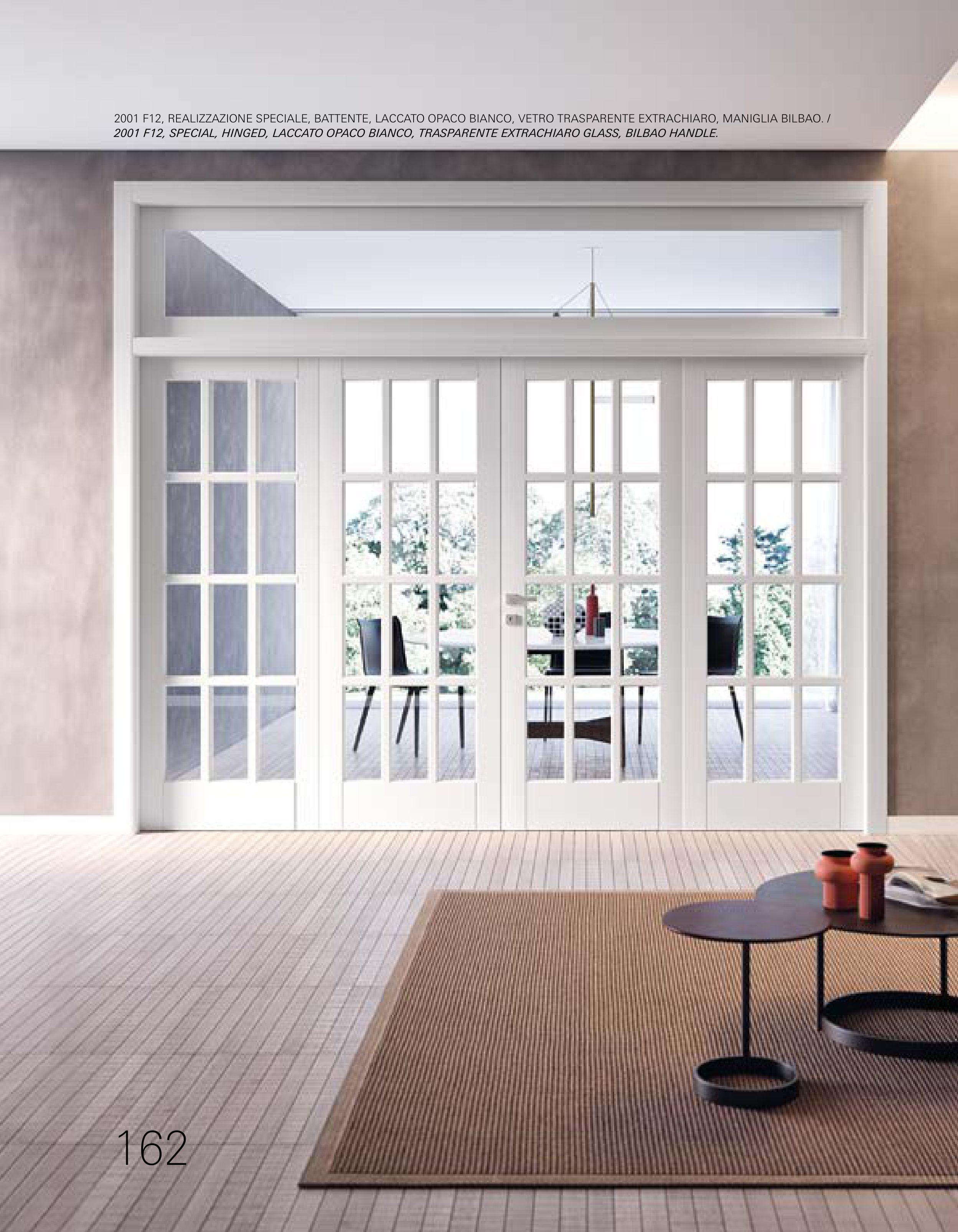 2001 F12, REALIZZAZIONE SPECIALE, BATTENTE, LACCATO OPACO BIANCO, VETRO TRASPARENTE EXTRACHIARO, MANIGLIA BILBAO. /