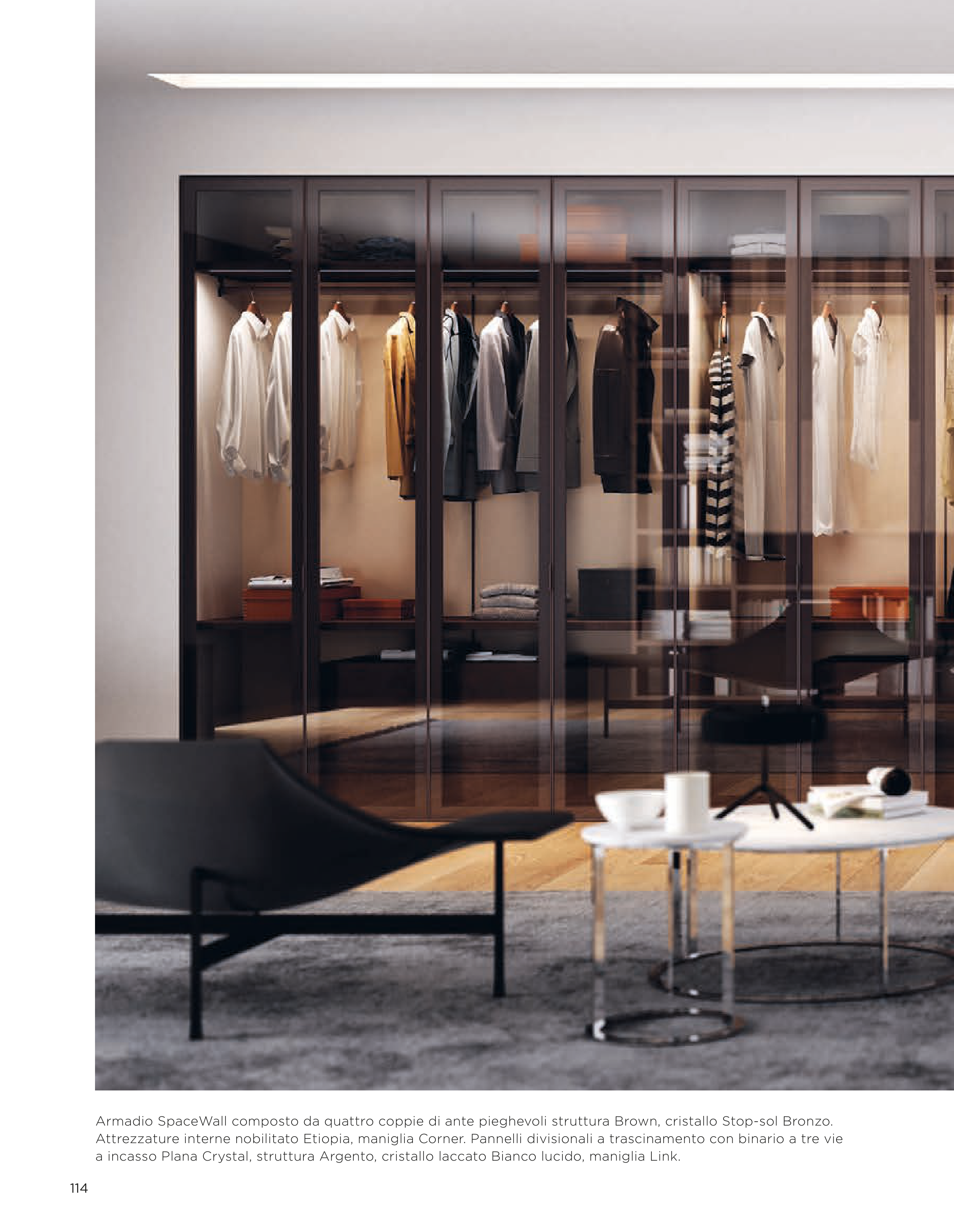 Armadio SpaceWall composto da quattro coppie di ante pieghevoli struttura Brown, cristallo Stop-sol Bronzo.