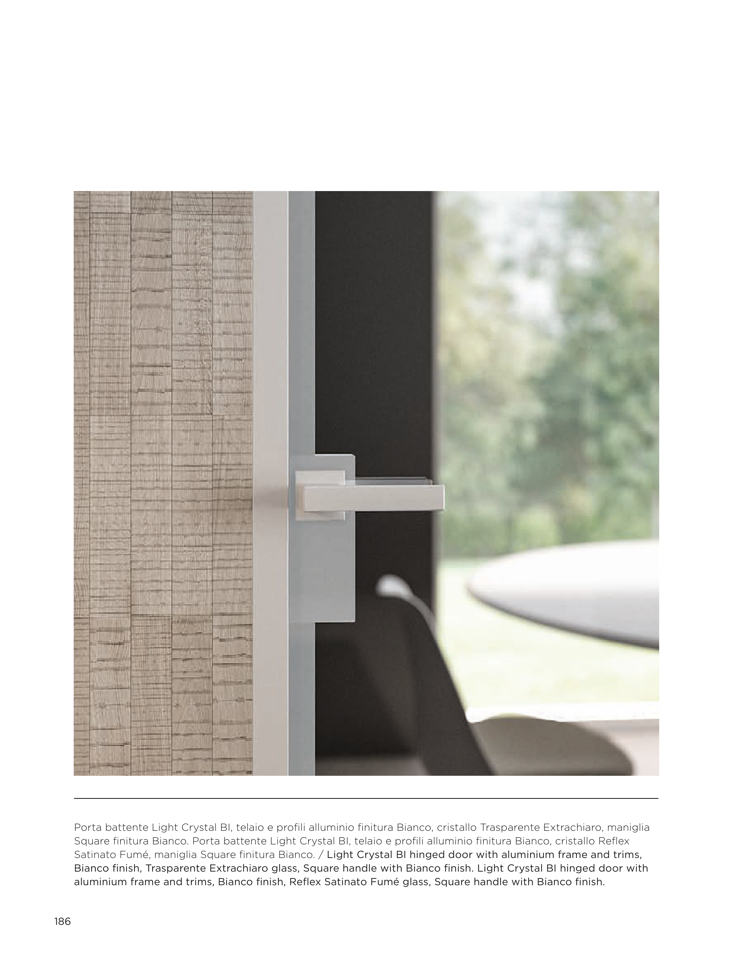 Satinato Fumé, maniglia Square finitura Bianco. / Light Crystal BI hinged door with aluminium frame and trims,
