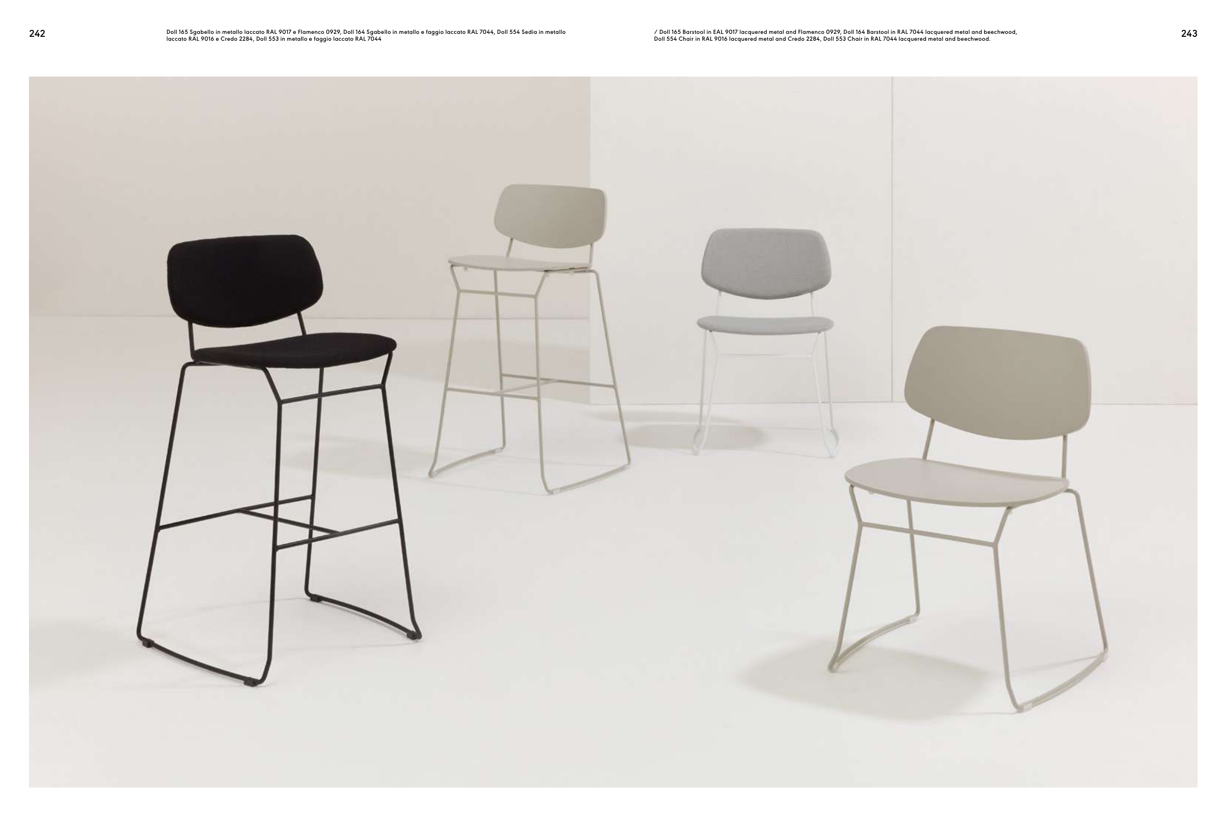 / Doll 165 Barstool in EAL 9017 lacquered metal and Flamenco 0929, Doll 164 Barstool in RAL 7044 lacquered metal and beechwood,