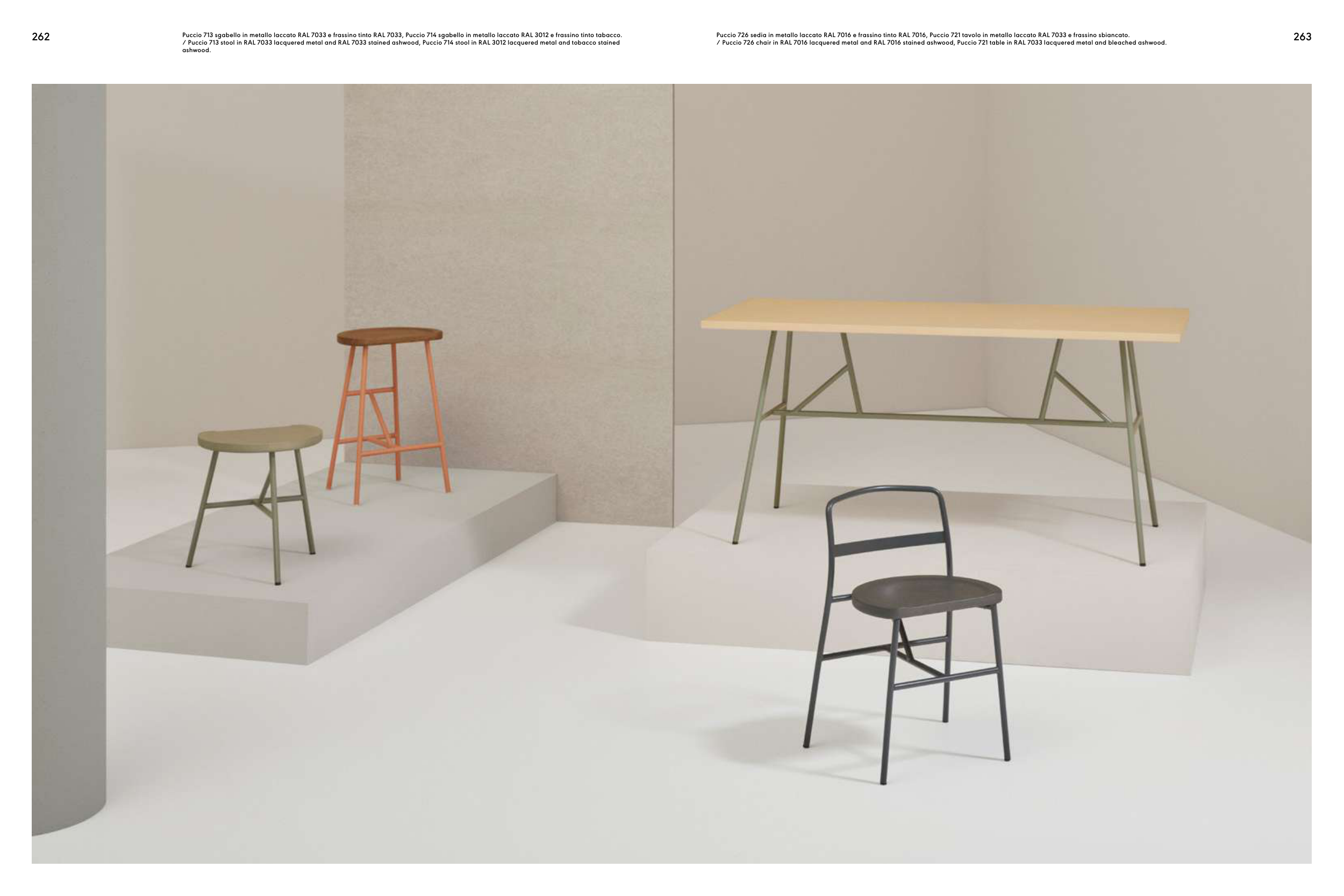 Puccio 726 sedia in metallo laccato RAL 7016 e frassino tinto RAL 7016, Puccio 721 tavolo in metallo laccato RAL 7033 e frassino sbiancato.