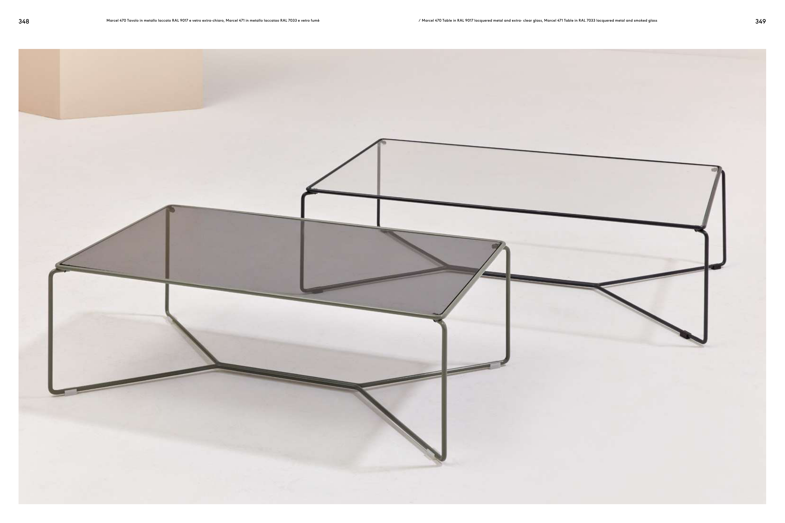 / Marcel 470 Table in RAL 9017 lacquered metal and extra- clear glass, Marcel 471 Table in RAL 7033 lacquered metal and smoked glass
