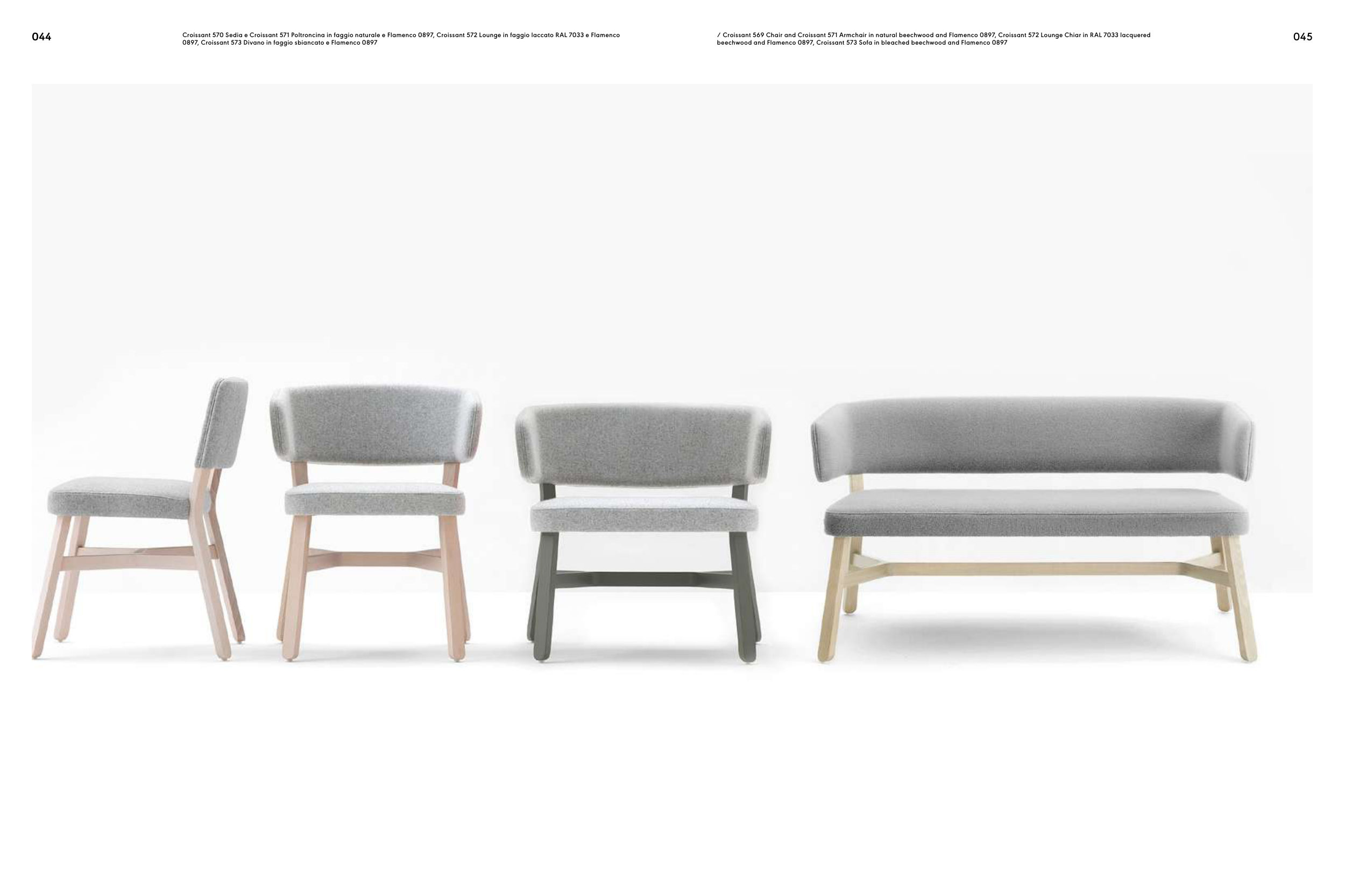 Croissant 570 Sedia e Croissant 571 Poltroncina in faggio naturale e Flamenco 0897, Croissant 572 Lounge in faggio laccato RAL 7033 e Flamenco