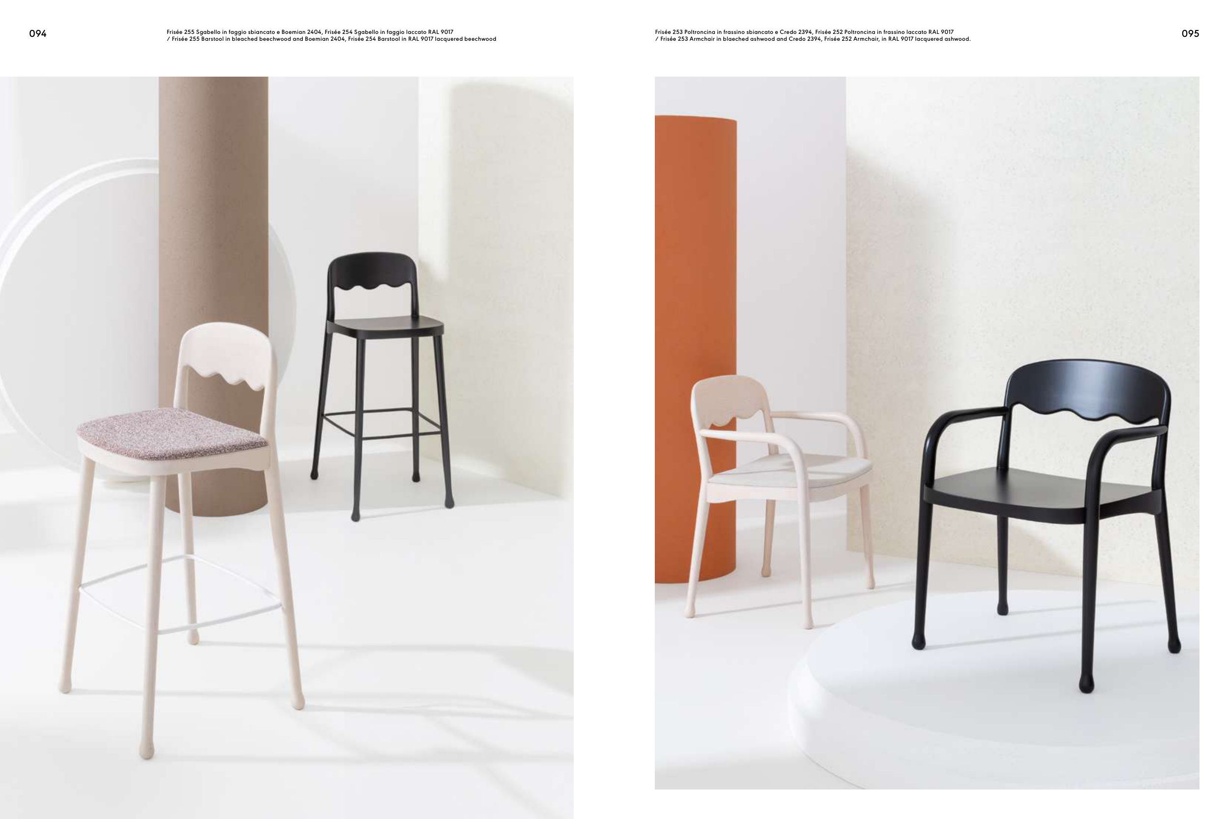 / Frisée 253 Armchair in blaeched ashwood and Credo 2394, Frisée 252 Armchair, in RAL 9017 lacquered ashwood.