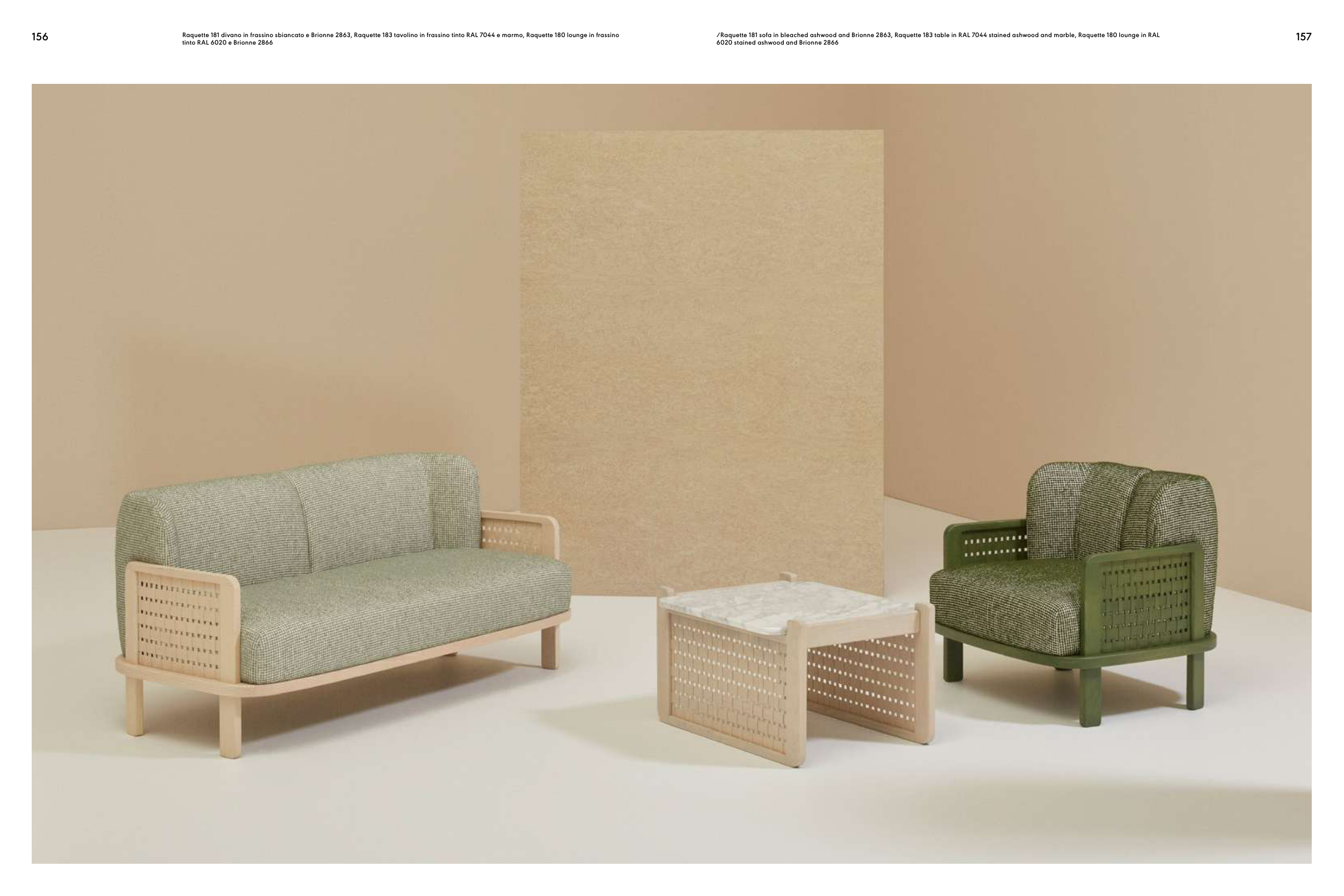 /Raquette 181 sofa in bleached ashwood and Brionne 2863, Raquette 183 table in RAL 7044 stained ashwood and marble, Raquette 180 lounge in RAL