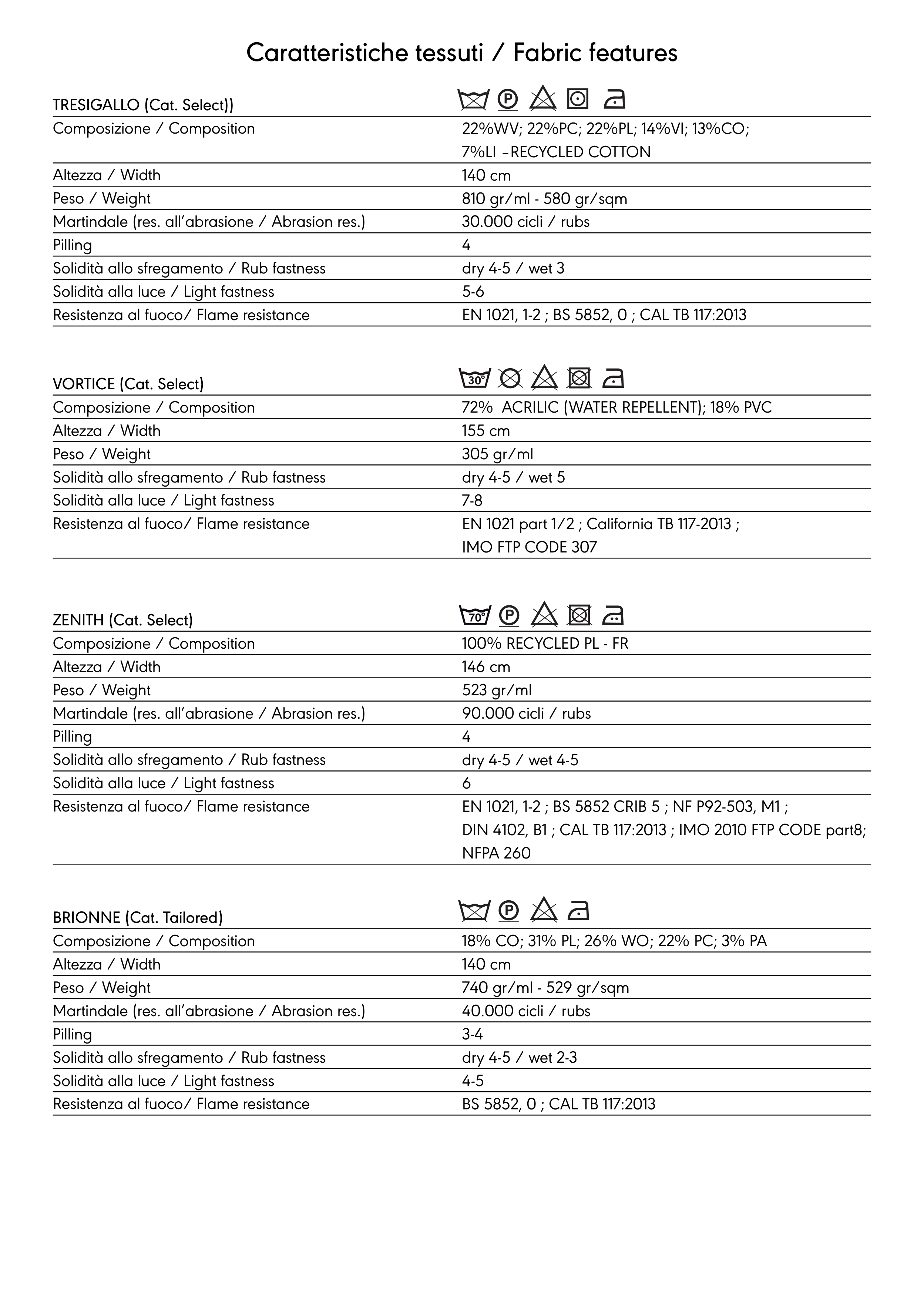 Caratteristiche tessuti / Fabric features