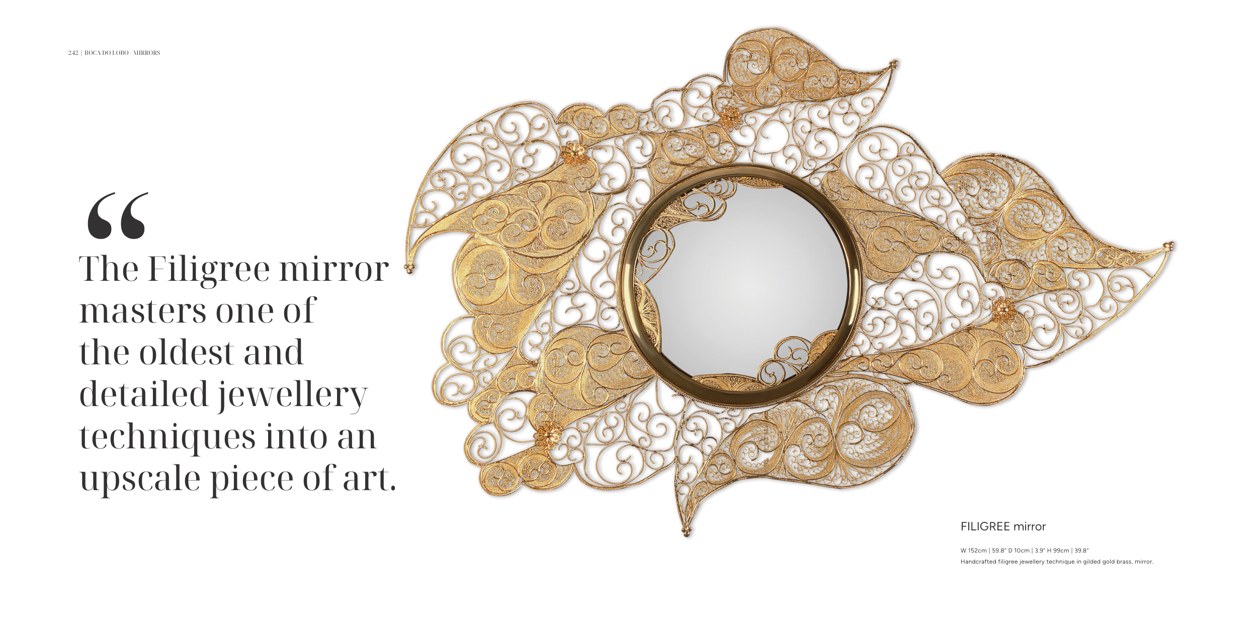 Handcrafted filigree jewellery technique in gilded gold brass, mirror.