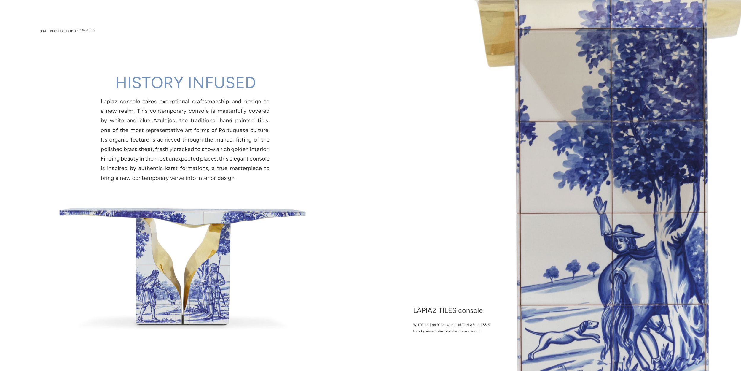 Hand painted tiles, Polished brass, wood.