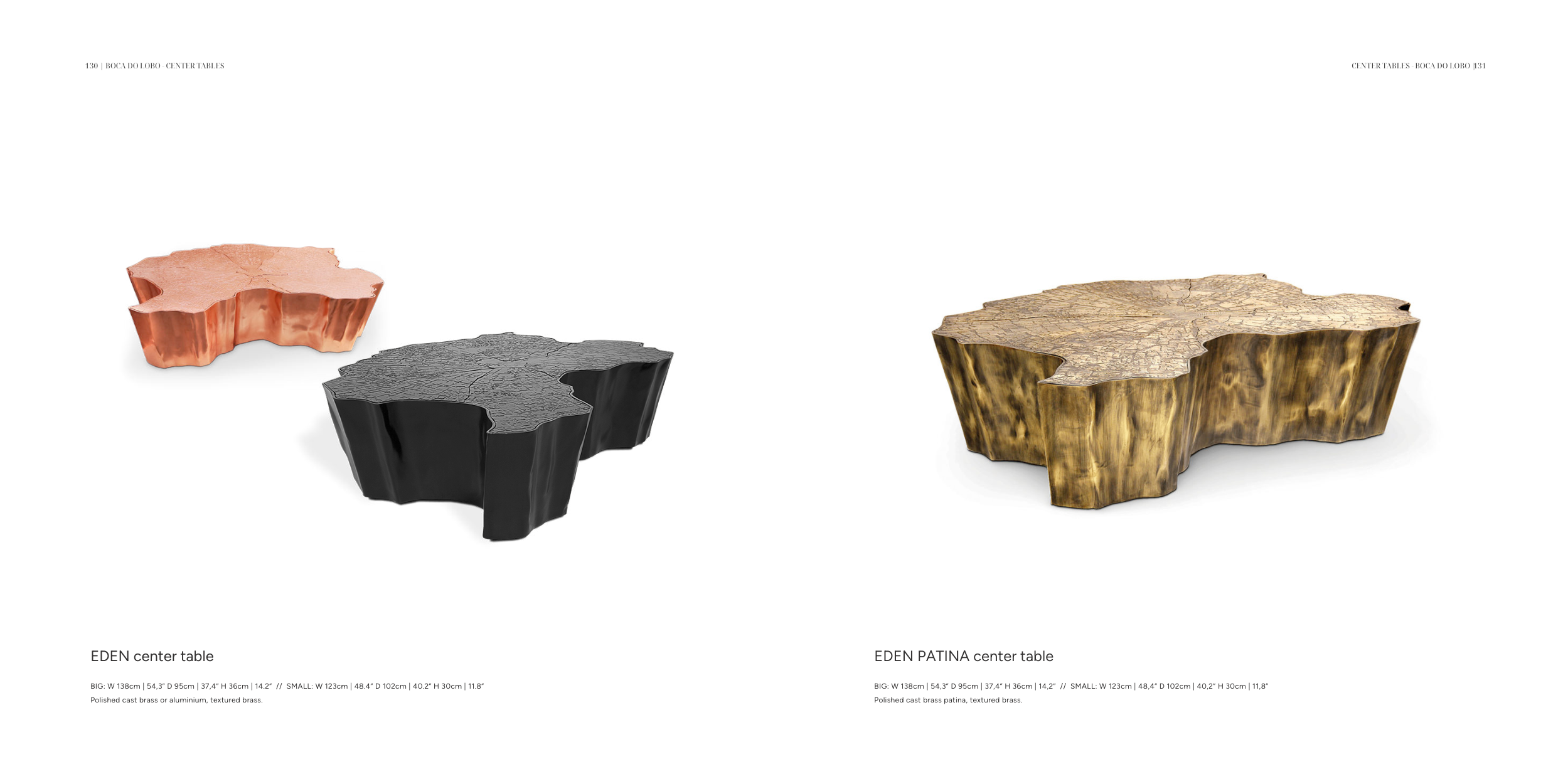 Polished cast brass patina, textured brass.
