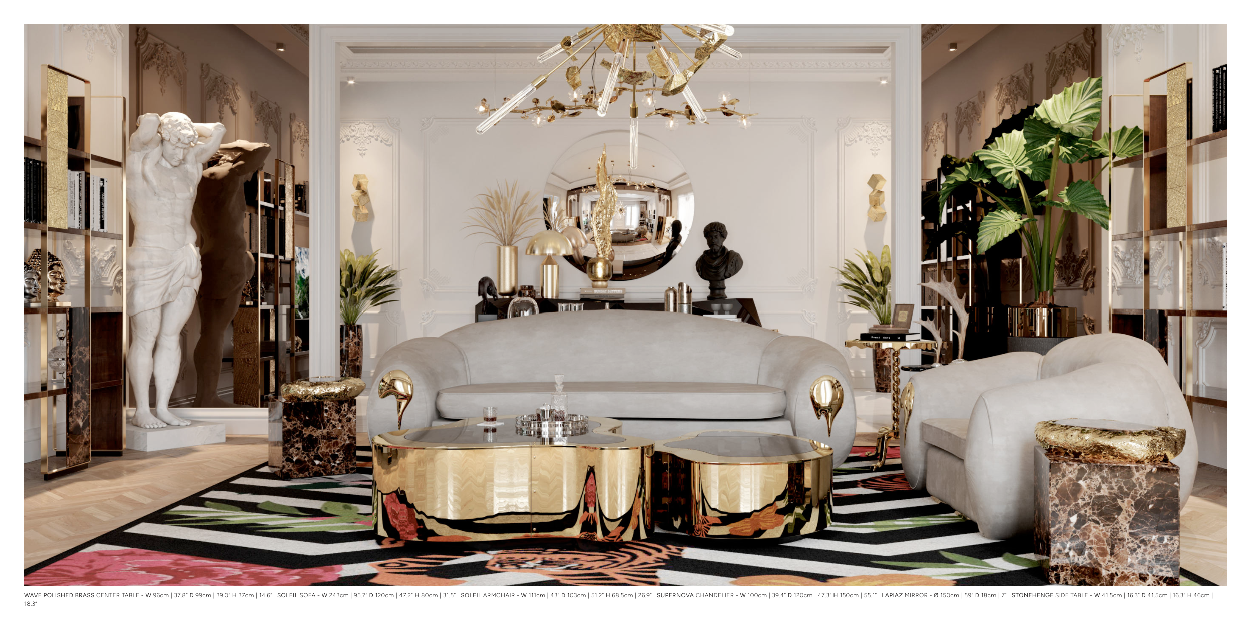 WAVE POLISHED BRASS CENTER TABLE - W 96cm | 37.8” D 99cm | 39.0” H 37cm | 14.6” SOLEIL SOFA - W 243cm | 95.7” D 120cm | 47.2” H 80cm | 31.5” SOLEIL ARMCHAIR - W 111cm | 43” D 103cm | 51.2” H 68.5cm | 26.9” SUPERNOVA CHANDELIER - W 100cm | 39.4” D 120cm | 47.3” H 150cm | 55.1” LAPIAZ MIRROR - Ø 150cm | 59” D 18cm | 7” STONEHENGE SIDE TABLE - W 41.5cm | 16.3” D 41.5cm | 16.3” H 46cm |