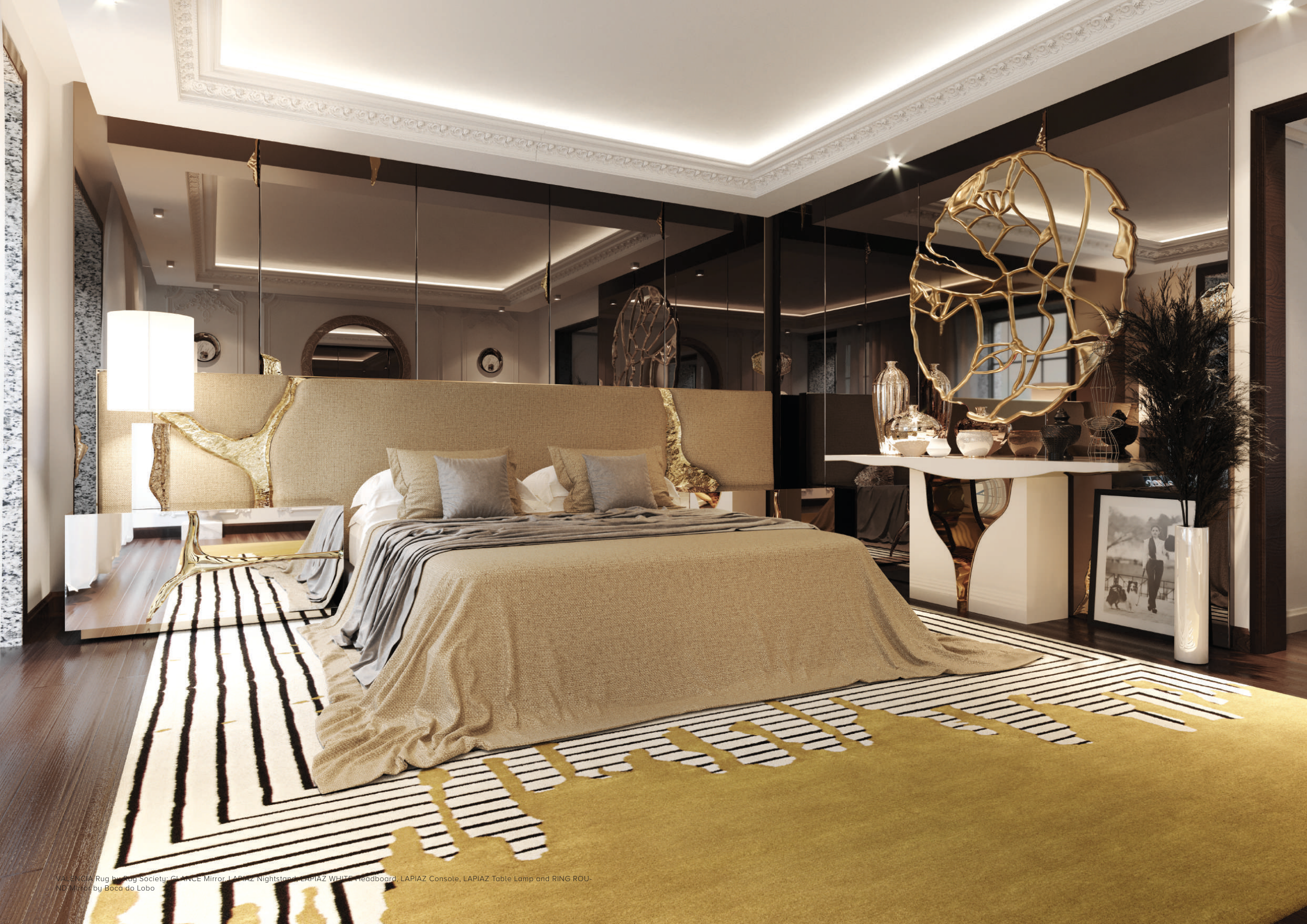 VALENCIA Rug by Rug’Society; GLANCE Mirror, LAPIAZ Nightstand, LAPIAZ WHITE Headboard, LAPIAZ Console, LAPIAZ Table Lamp and RING ROU-